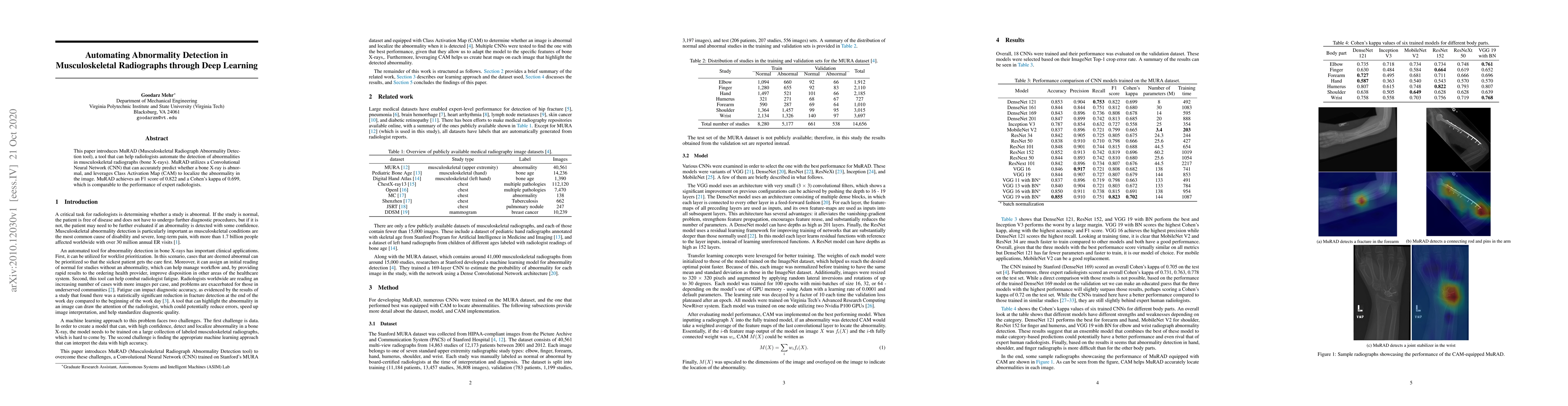 This paper presents MuRAD, a deep learning tool using CNNs to automate the detection of abnormalities in musculoskeletal radiographs, achieving an F1 score of 0.822 and a Cohen's kappa of 0.699, comparable to expert radiologists. MuRAD also employs Class Activation Maps to localize abnormalities.