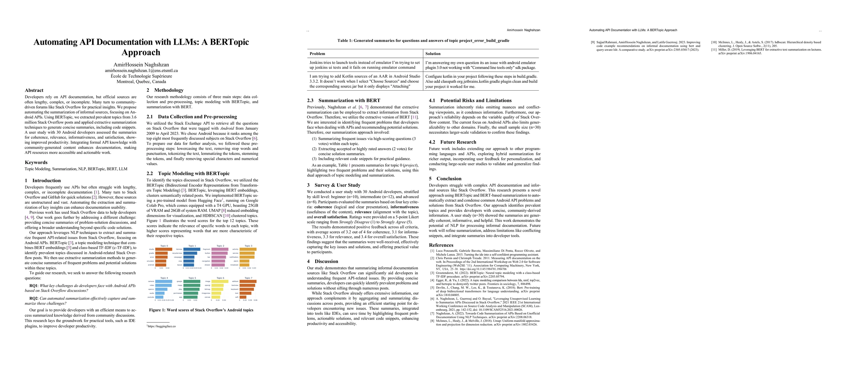 Developers rely on API documentation, but official sources are often lengthy, complex, or incomplete. Many turn to community-driven forums like Stack Overflow for practical insights. We propose automating the summarization of informal sources, focusing on Android APIs. Using BERTopic, we extracted prevalent topics from 3.6 million Stack Overflow posts and applied extractive summarization techniques to generate concise summaries, including code snippets. A user study with 30 Android developers assessed the summaries for coherence, relevance, informativeness, and satisfaction, showing improved productivity. Integrating formal API knowledge with community-generated content enhances documentation, making API resources more accessible and actionable work.