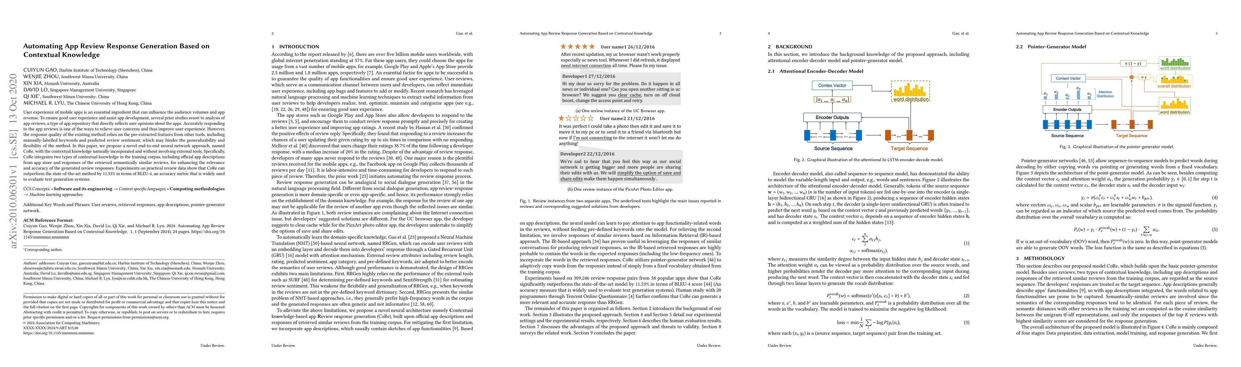 This paper proposes CoRe, an end-to-end neural network for generating automated responses to app reviews, incorporating contextual knowledge directly from app store descriptions and similar reviews. CoRe outperforms existing methods by 11.53% in BLEU-4 score, demonstrating improved relevance and accuracy in response generation.