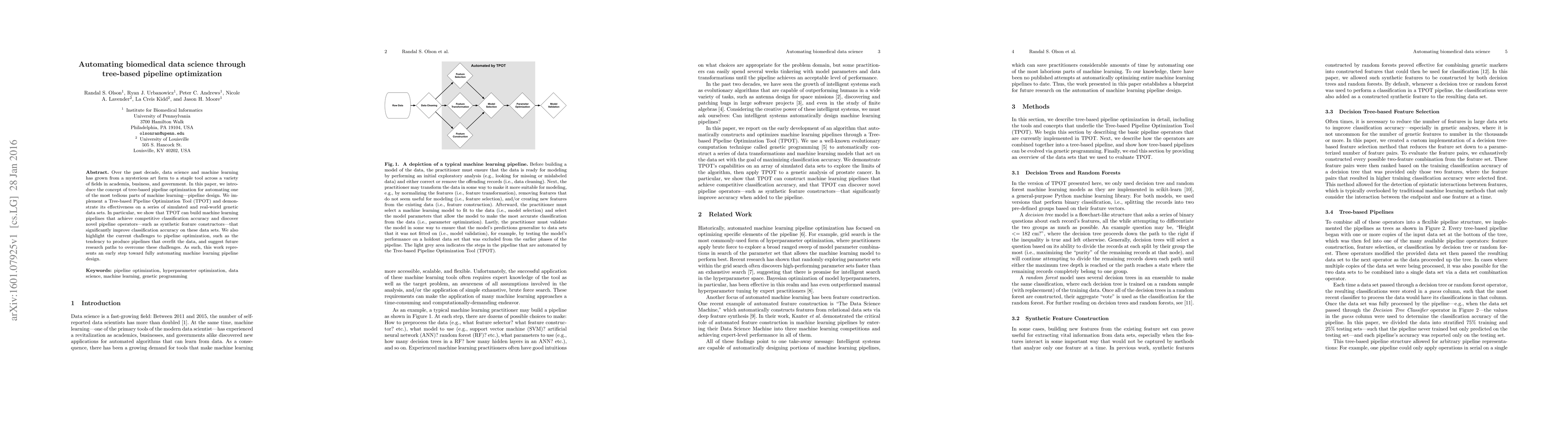 This paper introduces TPOT, a tool for automating tree-based pipeline optimization in machine learning, demonstrating its effectiveness on genetic datasets and highlighting its ability to discover novel operators. It also discusses challenges like overfitting and suggests future research directions.