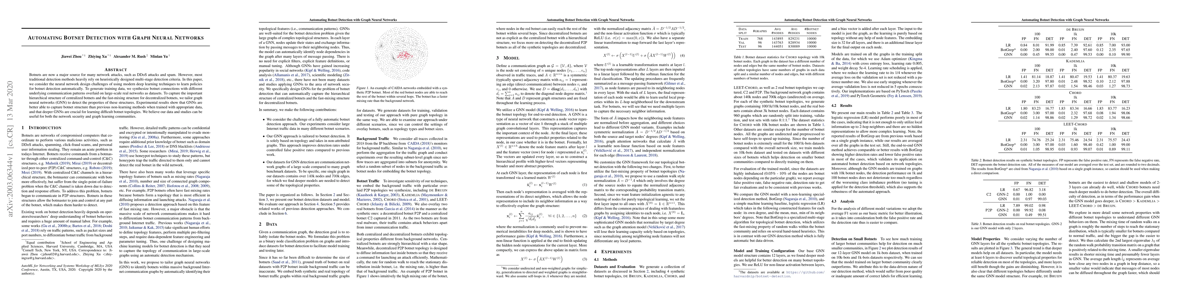 This paper proposes using graph neural networks (GNNs) to automate botnet detection, synthesizing botnet connections on real network datasets to train the models. GNNs outperform traditional heuristic methods by better capturing the hierarchical and fast-mixing structures of botnets, with deeper GNNs proving crucial for complex topologies.
