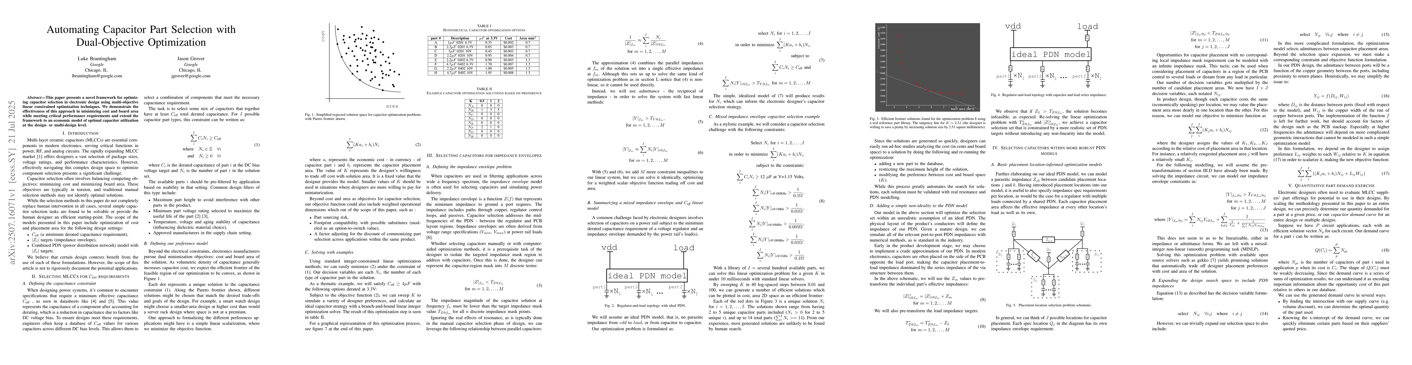 The paper presents a novel framework for capacitor selection in electronic design using multi-objective linear and non-linear constrained optimization techniques, demonstrating its effectiveness in minimizing cost and board area while meeting critical performance requirements.