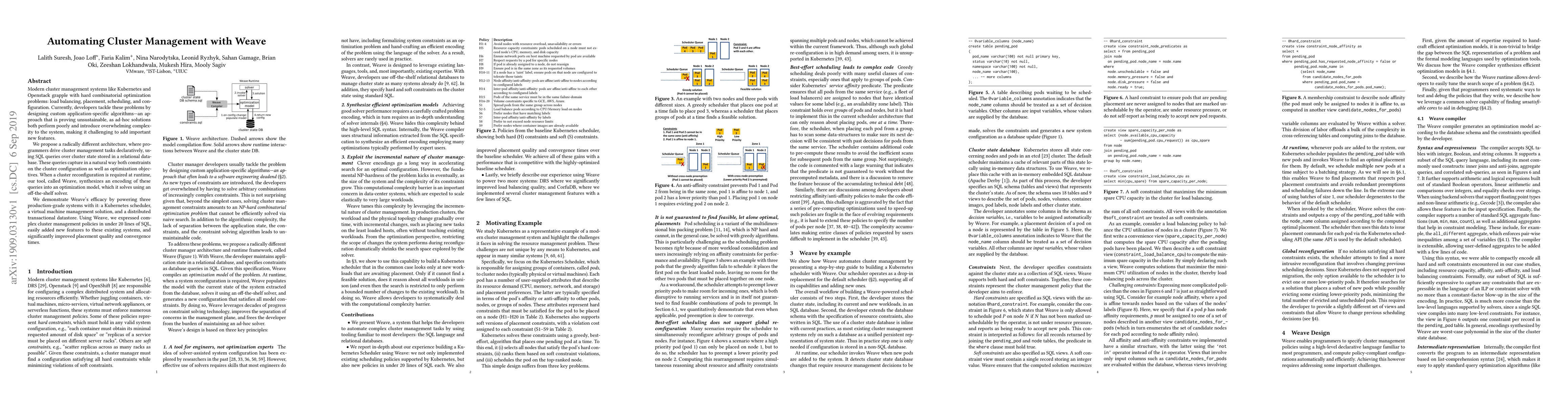Modern cluster management systems like Kubernetes and Openstack grapple with hard combinatorial optimization problems: load balancing, placement, scheduling, and configuration. Currently, developers tackle these problems by designing custom application-specific algorithms---an approach that is proving unsustainable, as ad-hoc solutions both perform poorly and introduce overwhelming complexity to the system, making it challenging to add important new features. We propose a radically different architecture, where programmers drive cluster management tasks declaratively, using SQL queries over cluster state stored in a relational database. These queries capture in a natural way both constraints on the cluster configuration as well as optimization objectives. When a cluster reconfiguration is required at runtime, our tool, called Weave, synthesizes an encoding of these queries into an optimization model, which it solves using an off-the-shelf solver. We demonstrate Weave's efficacy by powering three production-grade systems with it: a Kubernetes scheduler, a virtual machine management solution, and a distributed transactional datastore. Using Weave, we expressed complex cluster management policies in under 20 lines of SQL, easily added new features to these existing systems, and significantly improved placement quality and convergence times.