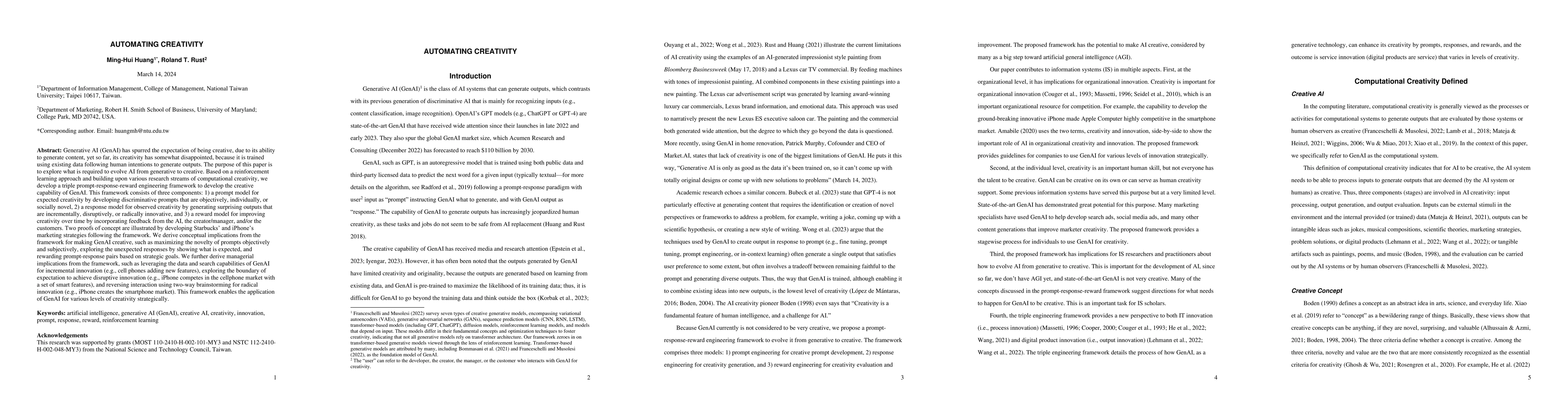 Generative AI (GenAI) has spurred the expectation of being creative, due to its ability to generate content, yet so far, its creativity has somewhat disappointed, because it is trained using existing data following human intentions to generate outputs. The purpose of this paper is to explore what is required to evolve AI from generative to creative. Based on a reinforcement learning approach and building upon various research streams of computational creativity, we develop a triple prompt-response-reward engineering framework to develop the creative capability of GenAI. This framework consists of three components: 1) a prompt model for expected creativity by developing discriminative prompts that are objectively, individually, or socially novel, 2) a response model for observed creativity by generating surprising outputs that are incrementally, disruptively, or radically innovative, and 3) a reward model for improving creativity over time by incorporating feedback from the AI, the creator/manager, and/or the customers. This framework enables the application of GenAI for various levels of creativity strategically.