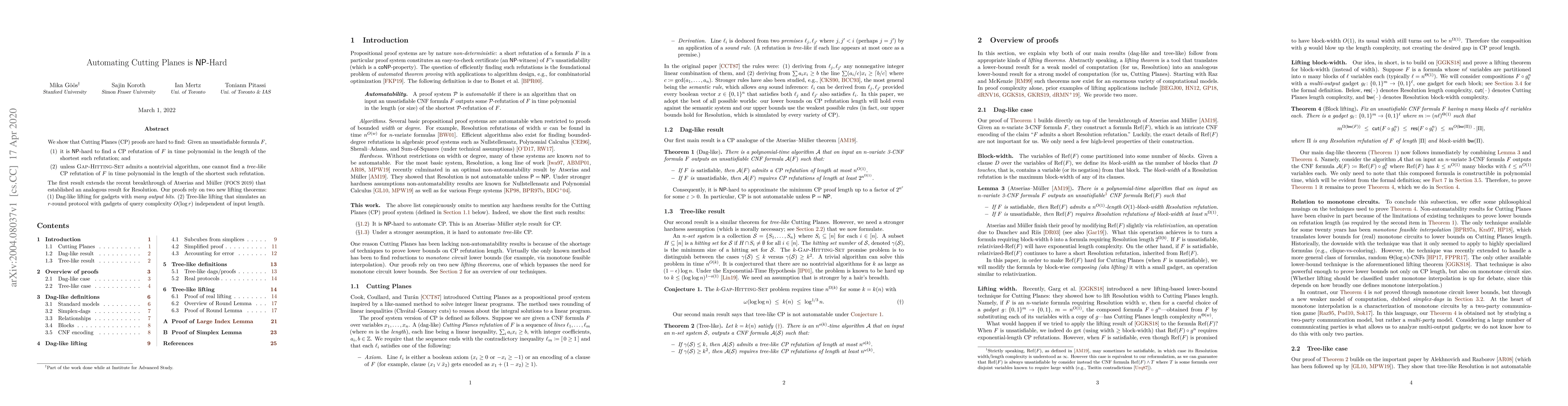 This paper demonstrates that finding Cutting Planes (CP) proofs for unsatisfiable formulas is NP-hard, extending the complexity results for Resolution proofs. It also shows that finding tree-like CP refutations is similarly hard unless certain algorithmic assumptions fail.