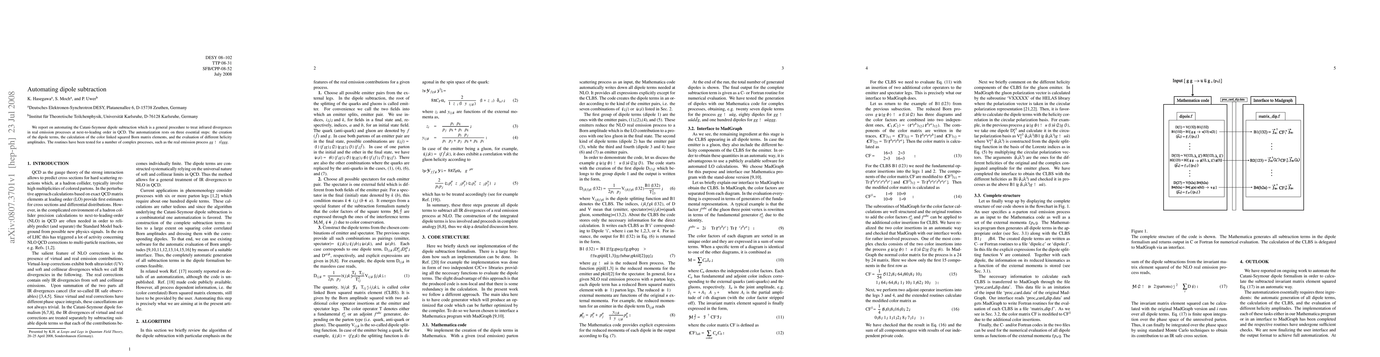 We report on automating the Catani-Seymour dipole subtraction which is a general procedure to treat infrared divergences in real emission processes at next-to-leading order in QCD. The automatization rests on three essential steps: the creation of the dipole terms, the calculation of the color linked squared Born matrix elements, and the evaluation of different helicity amplitudes. The routines have been tested for a number of complex processes, such as the real emission process gg --> t anti-t ggg.