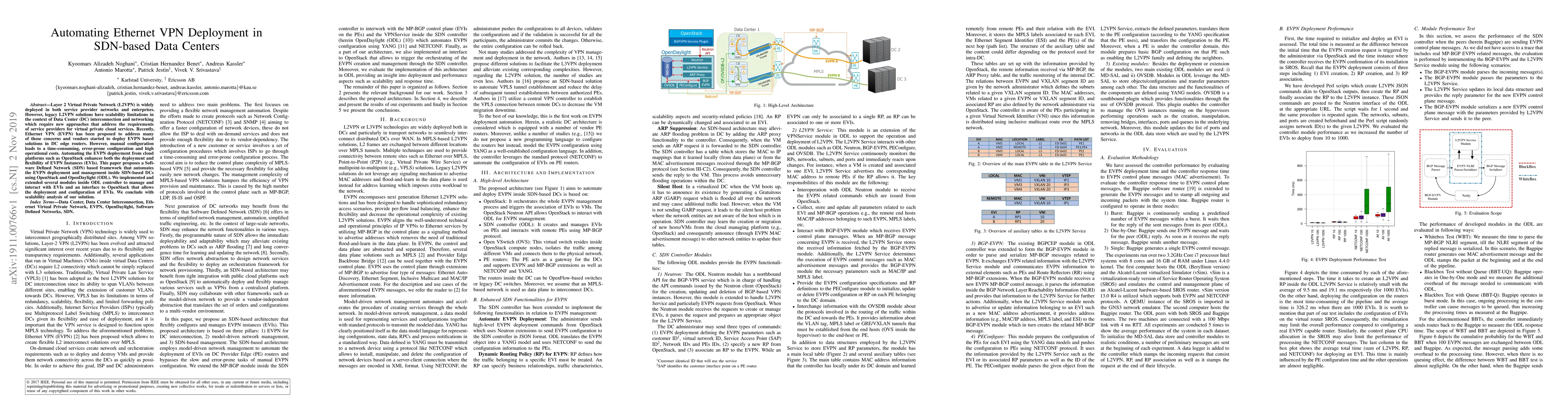 This paper proposes an SDN-based framework to automate Ethernet VPN (EVPN) deployment in data centers using OpenStack and OpenDaylight, aiming to enhance scalability and reduce operational costs by eliminating manual configuration errors. The solution includes extended modules for managing EVPN Instances and an interface to streamline EVI deployment.