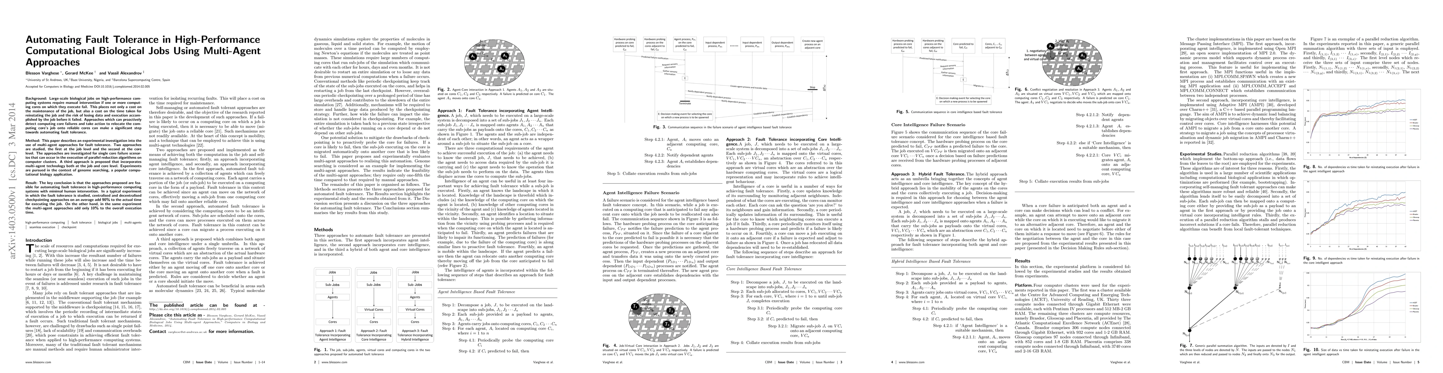This paper investigates multi-agent approaches for automating fault tolerance in high-performance computational biology jobs, finding that these methods significantly reduce execution time compared to traditional checkpointing techniques, achieving only a 10% increase in job execution time.
