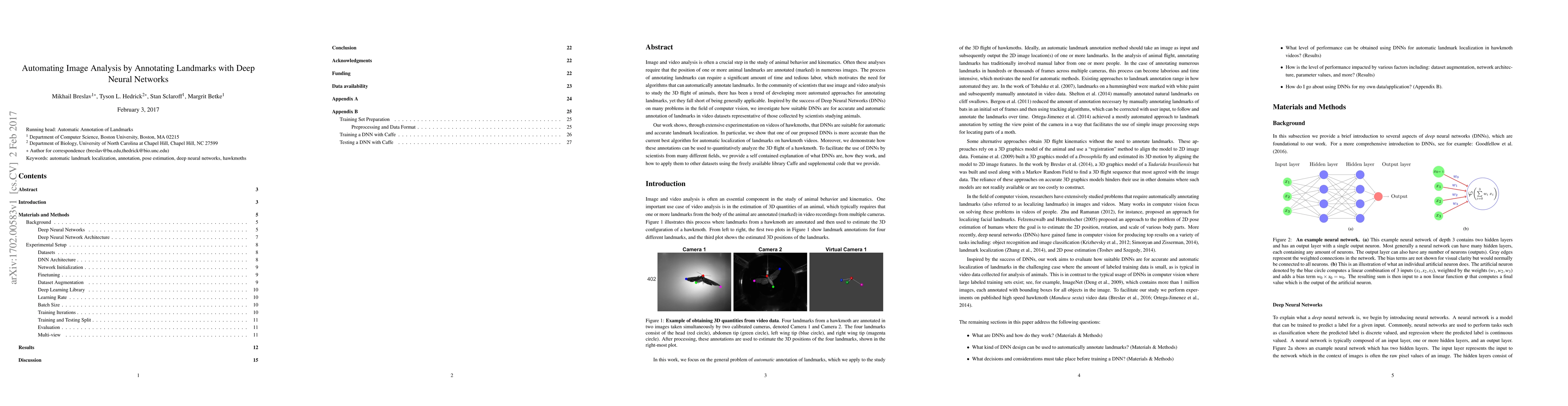 Image and video analysis is often a crucial step in the study of animal behavior and kinematics. Often these analyses require that the position of one or more animal landmarks are annotated (marked) in numerous images. The process of annotating landmarks can require a significant amount of time and tedious labor, which motivates the need for algorithms that can automatically annotate landmarks. In the community of scientists that use image and video analysis to study the 3D flight of animals, there has been a trend of developing more automated approaches for annotating landmarks, yet they fall short of being generally applicable. Inspired by the success of Deep Neural Networks (DNNs) on many problems in the field of computer vision, we investigate how suitable DNNs are for accurate and automatic annotation of landmarks in video datasets representative of those collected by scientists studying animals. Our work shows, through extensive experimentation on videos of hawkmoths, that DNNs are suitable for automatic and accurate landmark localization. In particular, we show that one of our proposed DNNs is more accurate than the current best algorithm for automatic localization of landmarks on hawkmoth videos. Moreover, we demonstrate how these annotations can be used to quantitatively analyze the 3D flight of a hawkmoth. To facilitate the use of DNNs by scientists from many different fields, we provide a self contained explanation of what DNNs are, how they work, and how to apply them to other datasets using the freely available library Caffe and supplemental code that we provide.