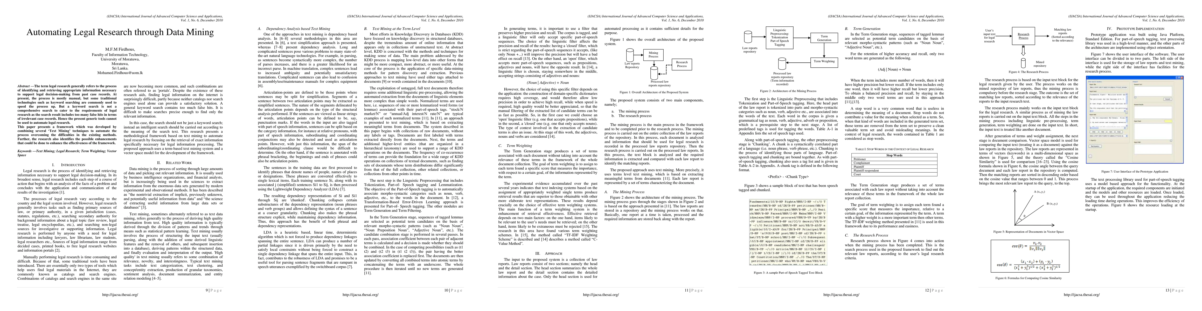 This paper presents a framework that utilizes advanced text mining techniques to automate legal research, addressing the limitations of traditional keyword searches by reducing false hits and enhancing the retrieval of relevant case records. The research also explores potential enhancements to improve the framework's effectiveness.