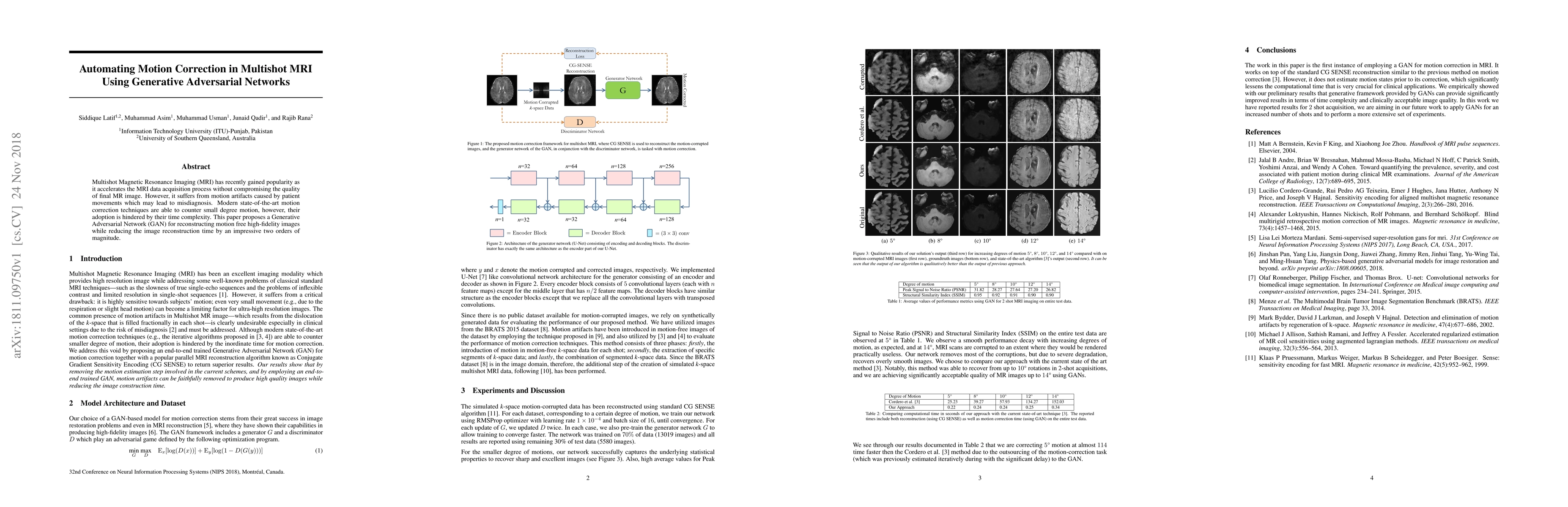 This paper proposes a Generative Adversarial Network (GAN) to automate motion correction in multishot MRI, significantly reducing reconstruction time and improving image fidelity despite patient movements. The method achieves a two-order-of-magnitude speedup compared to traditional techniques.
