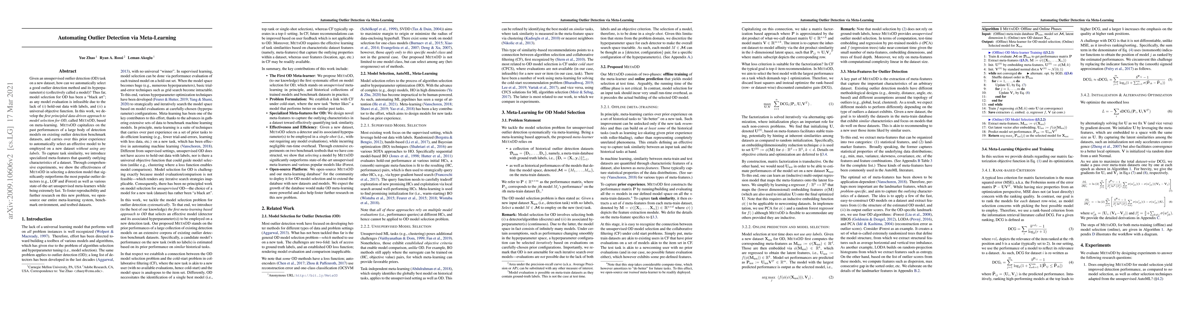 This paper proposes MetaOD, a meta-learning approach for automatically selecting effective outlier detection methods and hyperparameters on new datasets without labeled data. It leverages past performance data from benchmark datasets and introduces meta-features to quantify dataset similarities, achieving superior performance compared to existing detectors.