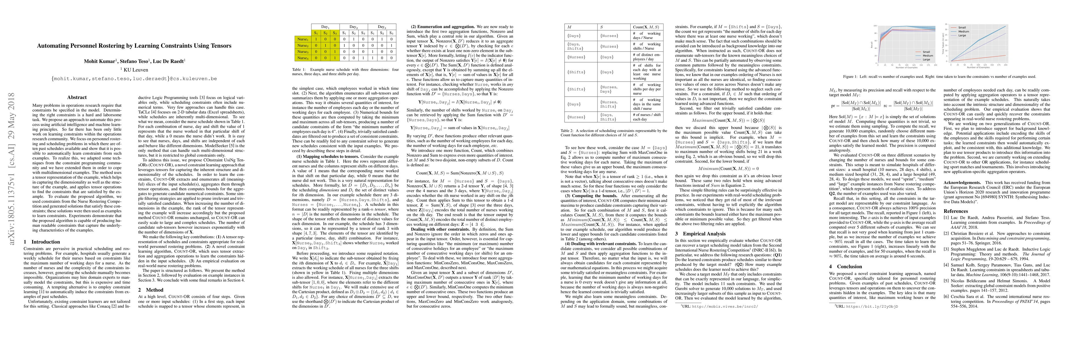 This paper proposes an AI-based method to automate the learning of constraints for personnel rostering using tensor representations and operations, demonstrating its effectiveness through the Nurse Rostering Competition and showing it can generate human-readable constraints from past schedules.