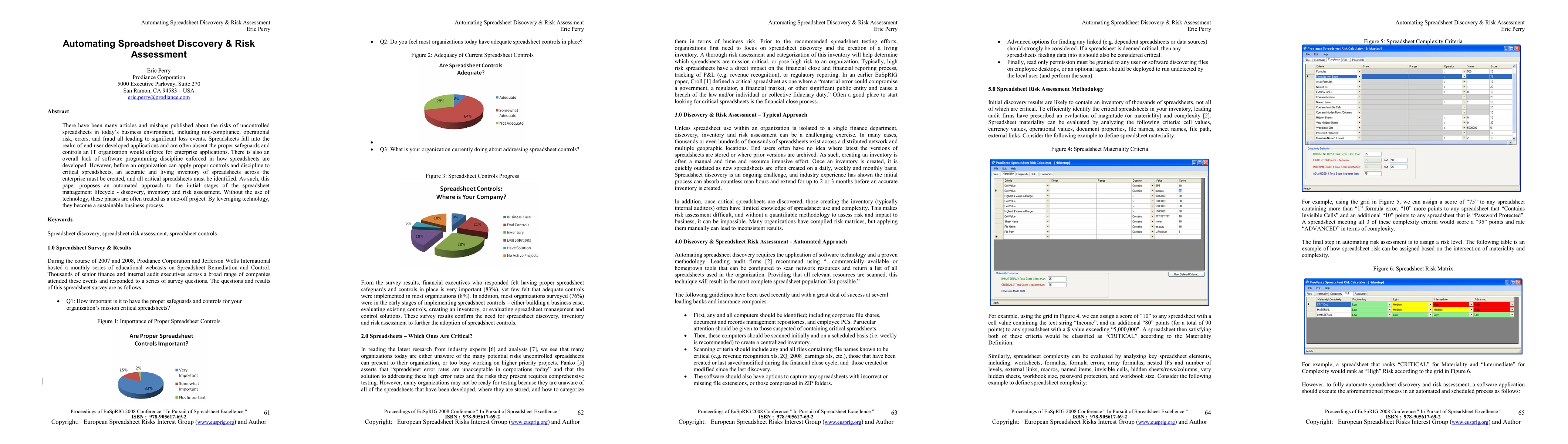 This paper proposes an automated method for discovering, inventorying, and assessing risks associated with spreadsheets in enterprise environments. It aims to transform these traditionally manual processes into sustainable business practices, addressing issues like non-compliance and fraud.