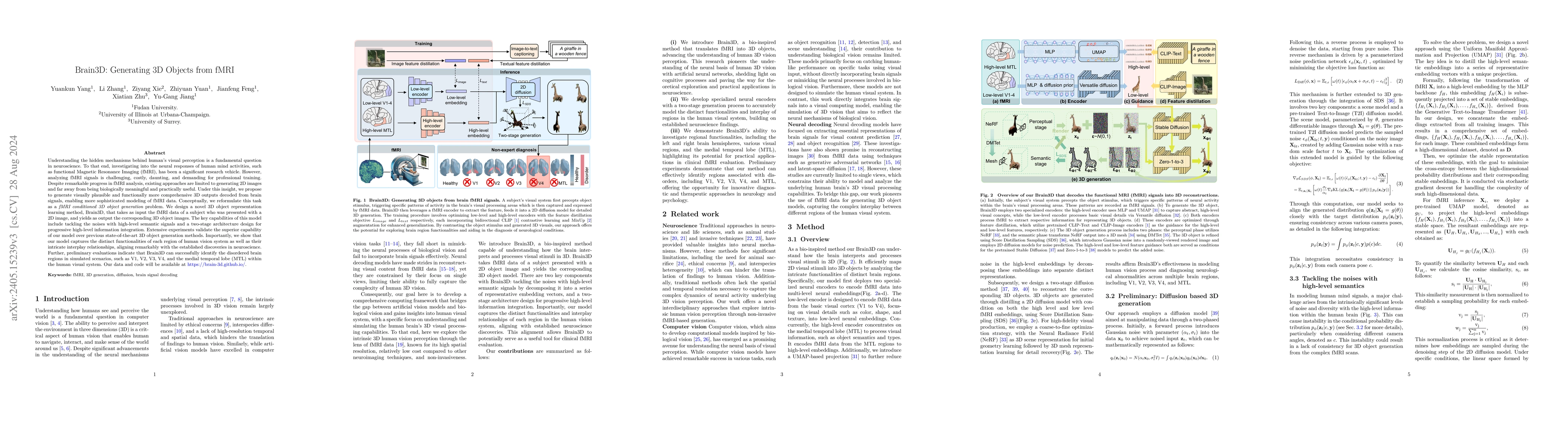 Understanding the hidden mechanisms behind human's visual perception is a fundamental quest in neuroscience, underpins a wide variety of critical applications, e.g. clinical diagnosis. To that end, investigating into the neural responses of human mind activities, such as functional Magnetic Resonance Imaging (fMRI), has been a significant research vehicle. However, analyzing fMRI signals is challenging, costly, daunting, and demanding for professional training. Despite remarkable progress in artificial intelligence (AI) based fMRI analysis, existing solutions are limited and far away from being clinically meaningful. In this context, we leap forward to demonstrate how AI can go beyond the current state of the art by decoding fMRI into visually plausible 3D visuals, enabling automatic clinical analysis of fMRI data, even without healthcare professionals. Innovationally, we reformulate the task of analyzing fMRI data as a conditional 3D scene reconstruction problem. We design a novel cross-modal 3D scene representation learning method, Brain3D, that takes as input the fMRI data of a subject who was presented with a 2D object image, and yields as output the corresponding 3D object visuals. Importantly, we show that in simulated scenarios our AI agent captures the distinct functionalities of each region of human vision system as well as their intricate interplay relationships, aligning remarkably with the established discoveries of neuroscience. Non-expert diagnosis indicate that Brain3D can successfully identify the disordered brain regions, such as V1, V2, V3, V4, and the medial temporal lobe (MTL) within the human visual system. We also present results in cross-modal 3D visual construction setting, showcasing the perception quality of our 3D scene generation.