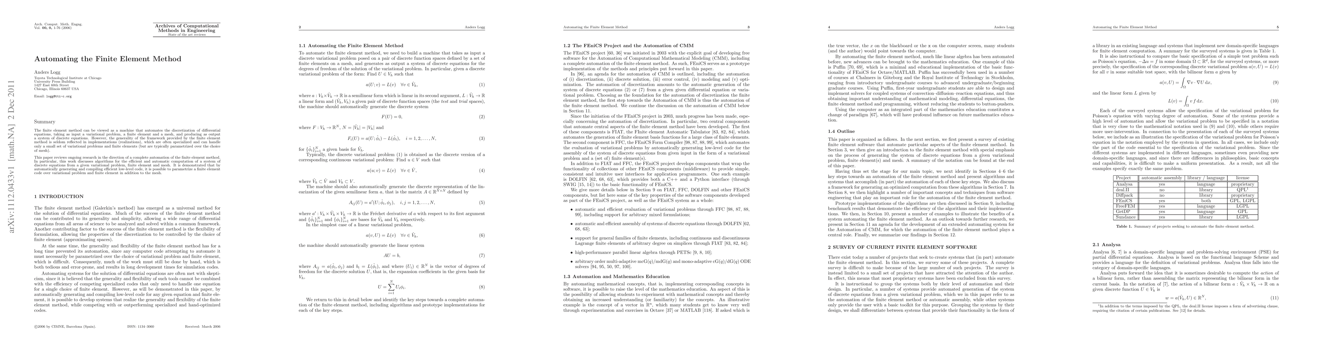 This paper reviews efforts to fully automate the finite element method, focusing on algorithms that efficiently compute discrete equations from variational problems, finite elements, and meshes. It demonstrates the potential of automatically generating and compiling low-level code to parametrize finite element implementations over variational problems and finite elements.