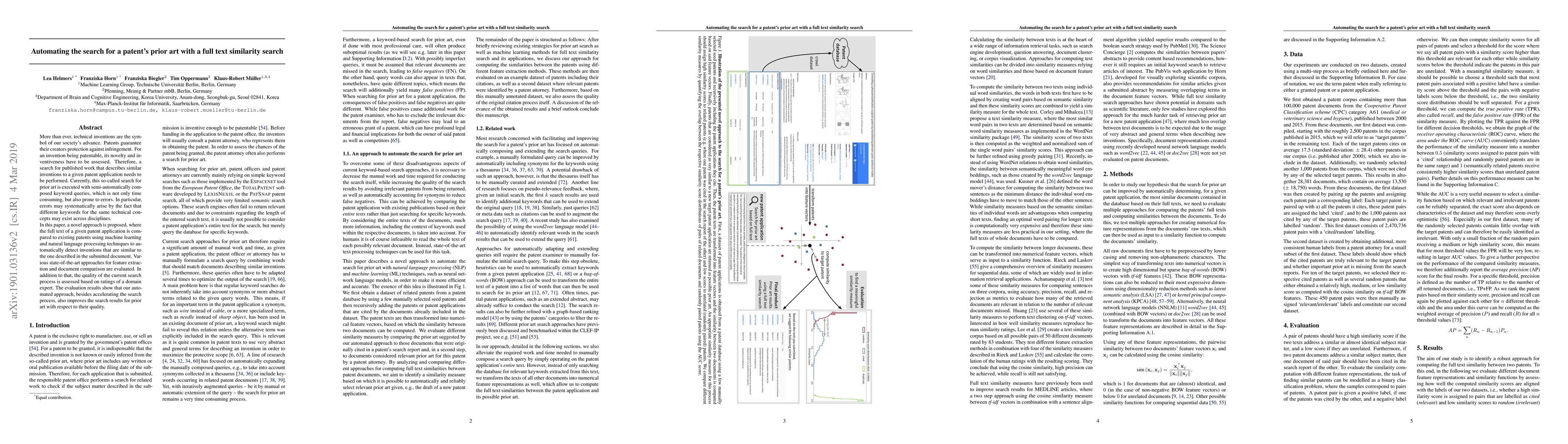 This paper proposes an automated method using machine learning and NLP to compare the full text of patent applications to existing patents for prior art searches, aiming to improve both speed and accuracy over traditional keyword-based methods. Evaluations show the new approach not only accelerates the search but also enhances the quality of prior art detection.