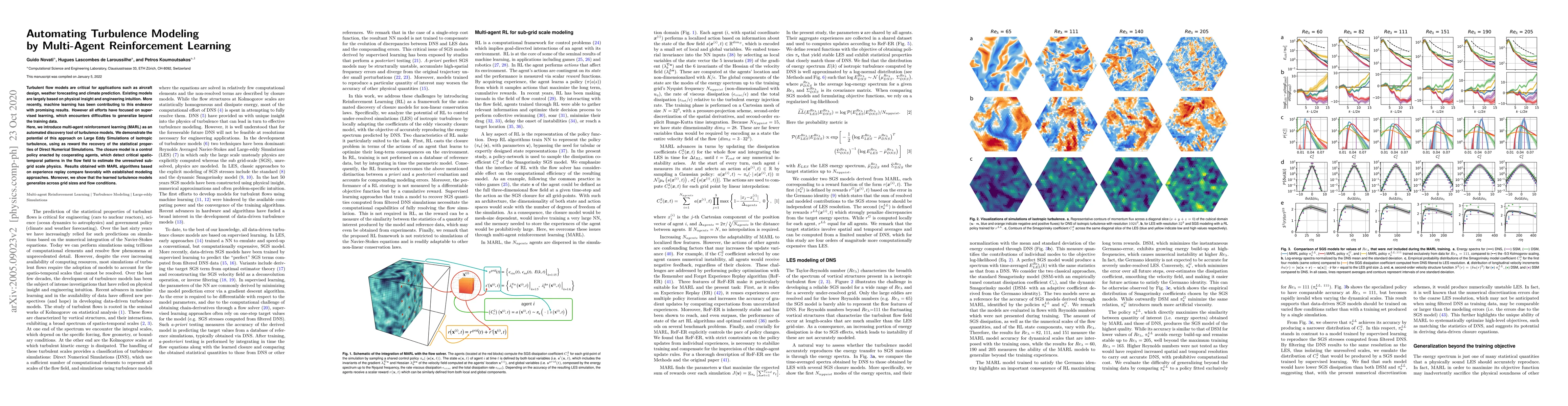 This paper proposes using multi-agent reinforcement learning to automate turbulence modeling, demonstrating its effectiveness on Large Eddy Simulations. The approach outperforms traditional dynamic sub-grid scale models and shows good generalization across different grid sizes and flow conditions.