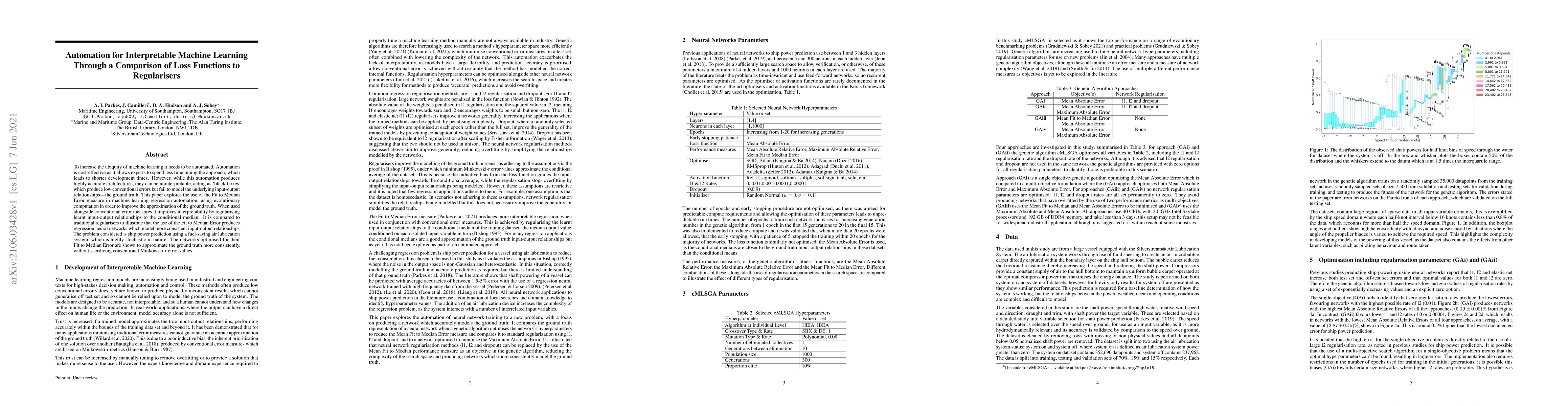To increase the ubiquity of machine learning it needs to be automated. Automation is cost-effective as it allows experts to spend less time tuning the approach, which leads to shorter development times. However, while this automation produces highly accurate architectures, they can be uninterpretable, acting as `black-boxes' which produce low conventional errors but fail to model the underlying input-output relationships -- the ground truth. This paper explores the use of the Fit to Median Error measure in machine learning regression automation, using evolutionary computation in order to improve the approximation of the ground truth. When used alongside conventional error measures it improves interpretability by regularising learnt input-output relationships to the conditional median. It is compared to traditional regularisers to illustrate that the use of the Fit to Median Error produces regression neural networks which model more consistent input-output relationships. The problem considered is ship power prediction using a fuel-saving air lubrication system, which is highly stochastic in nature. The networks optimised for their Fit to Median Error are shown to approximate the ground truth more consistently, without sacrificing conventional Minkowski-r error values.