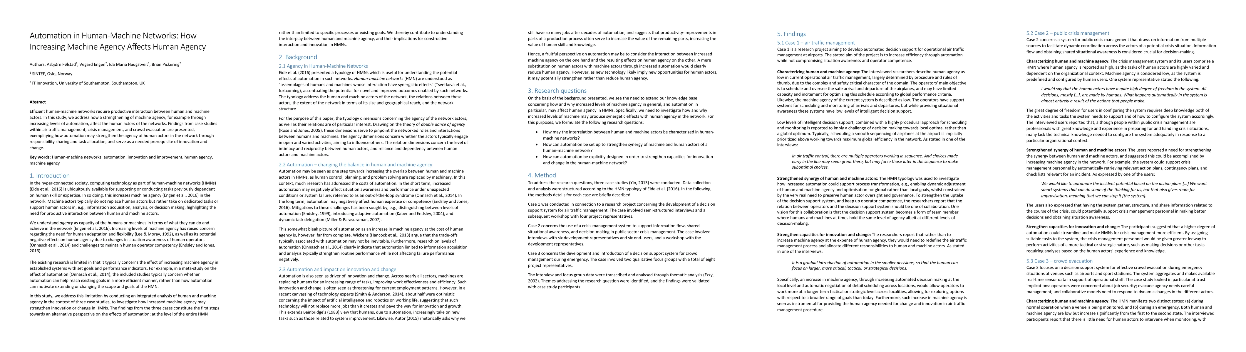 This study investigates how enhanced machine agency via increased automation influences human agency within human-machine networks, using case studies from air traffic management, crisis management, and crowd evacuation to demonstrate that automation can bolster human agency through shared responsibility and task allocation, facilitating innovation and change.