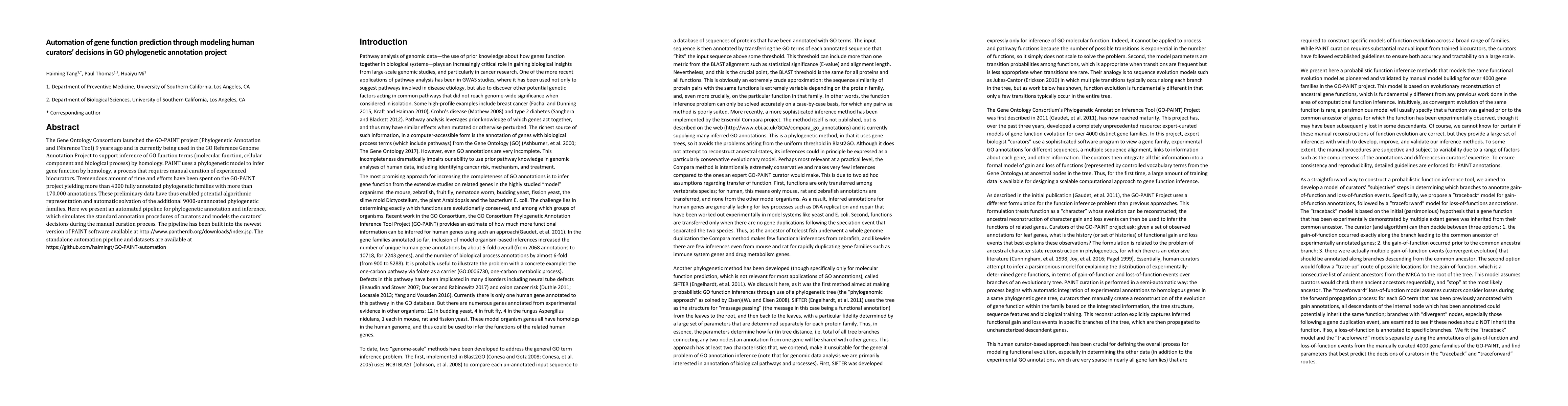 This paper introduces an automated pipeline for gene function prediction that mimics human curators' decisions in the GO-PAINT project, aiming to reduce the manual effort required for phylogenetic annotation. The pipeline is integrated into the latest version of PAINT software, available for download and further use on GitHub.