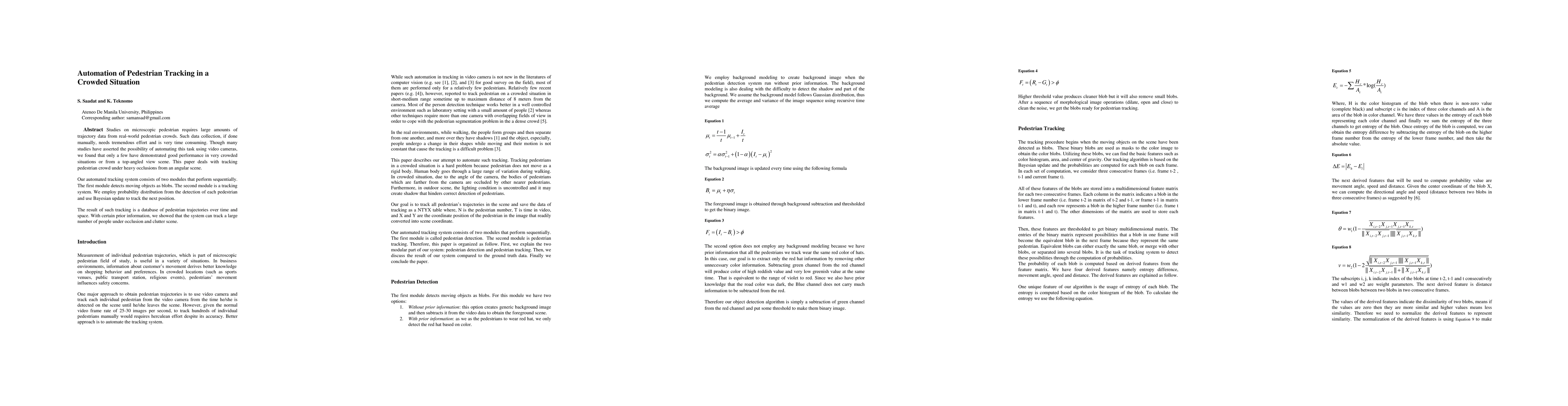 This paper presents an automated system for tracking pedestrians in crowded, occluded scenes using video cameras. It employs a two-module approach: one for detecting moving objects and another for tracking using Bayesian updates based on probability distributions, resulting in a database of pedestrian trajectories.