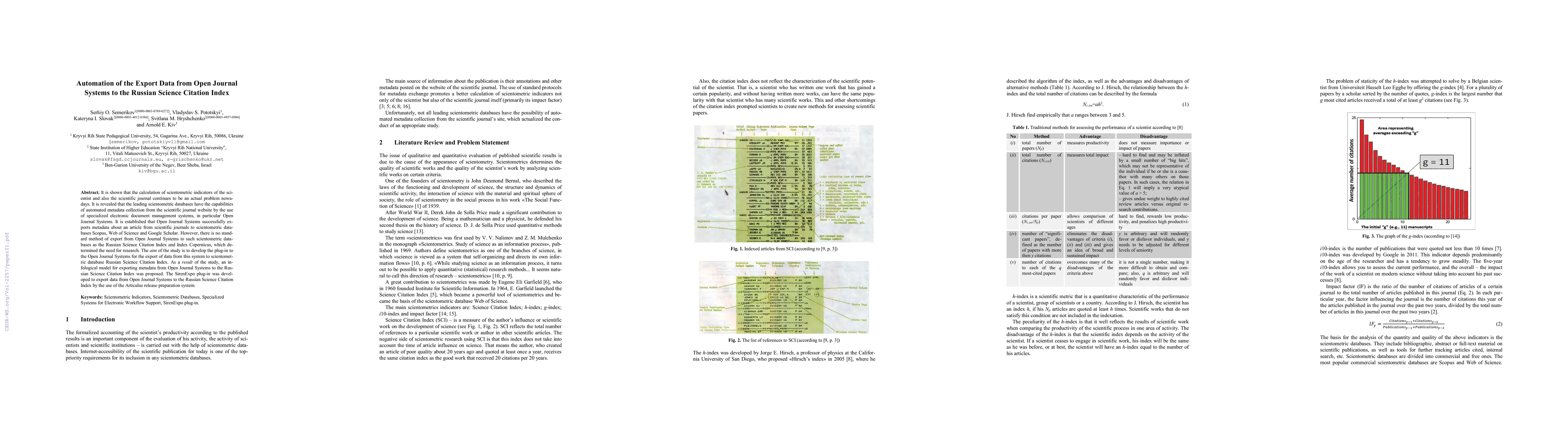 It is shown that the calculation of scientometric indicators of the scientist and also the scientific journal continues to be an actual problem nowadays. It is revealed that the leading scientometric databases have the capabilities of automated metadata collection from the scientific journal website by the use of specialized electronic document management systems, in particular Open Journal Systems. It is established that Open Journal Systems successfully exports metadata about an article from scientific journals to scientometric databases Scopus, Web of Science and Google Scholar. However, there is no standard method of export from Open Journal Systems to such scientometric databases as the Russian Science Citation Index and Index Copernicus, which determined the need for research. The aim of the study is to develop the plug-in to the Open Journal Systems for the export of data from this system to scientometric database Russian Science Citation Index. As a result of the study, an infological model for exporting metadata from Open Journal Systems to the Russian Science Citation Index was proposed. The SirenExpo plug-in was developed to export data from Open Journal Systems to the Russian Science Citation Index by the use of the Articulus release preparation system.