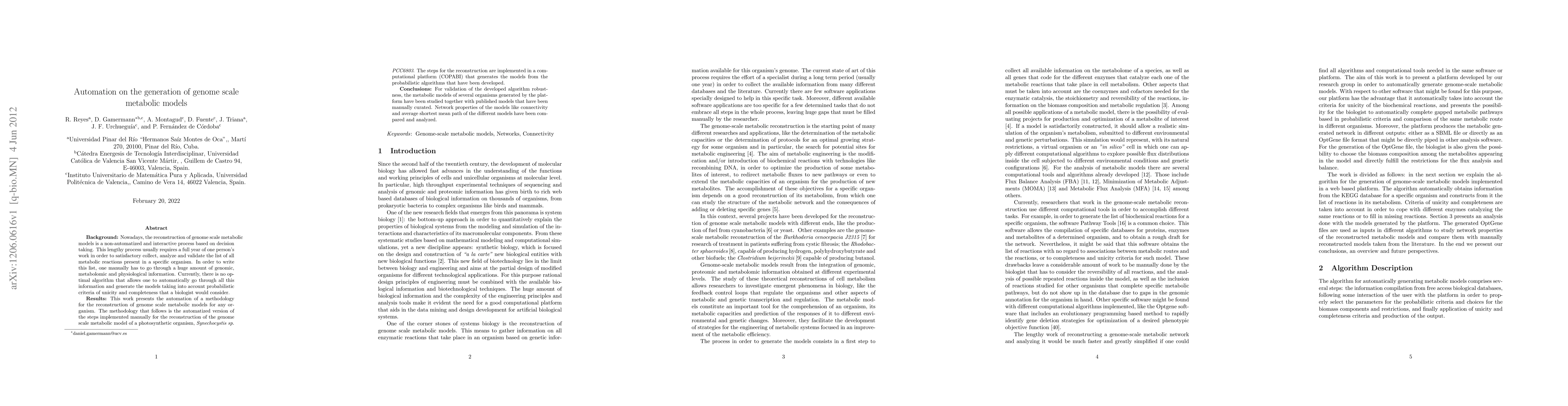 This research presents an automated computational platform (COPABI) for the generation of genome-scale metabolic models using probabilistic algorithms, based on the manual reconstruction process of the photosynthetic organism Synechocystis sp. PCC6803.