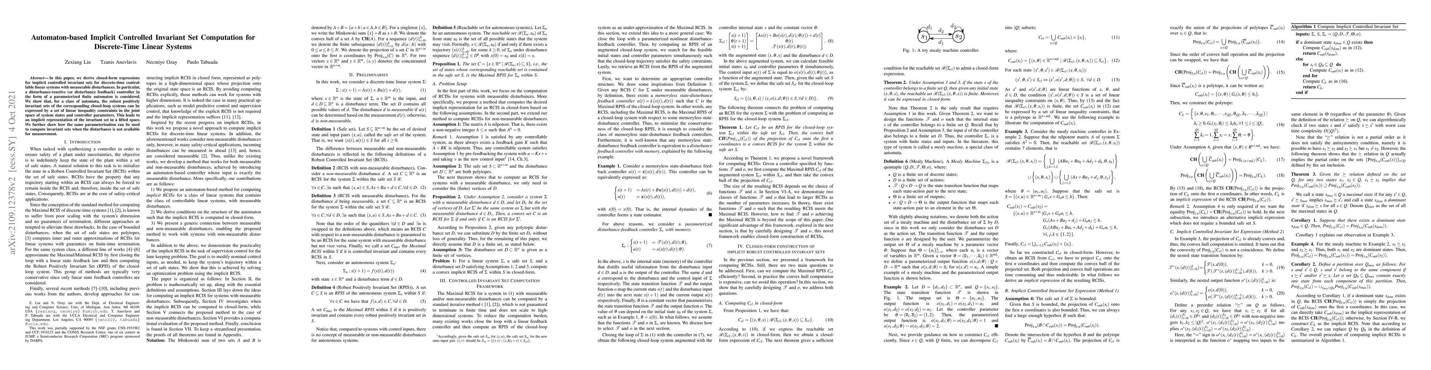 This paper derives closed-form expressions for implicit controlled invariant sets for discrete-time linear systems using parameterized finite automata. It provides a method to represent robust positively invariant sets through linear inequality constraints.