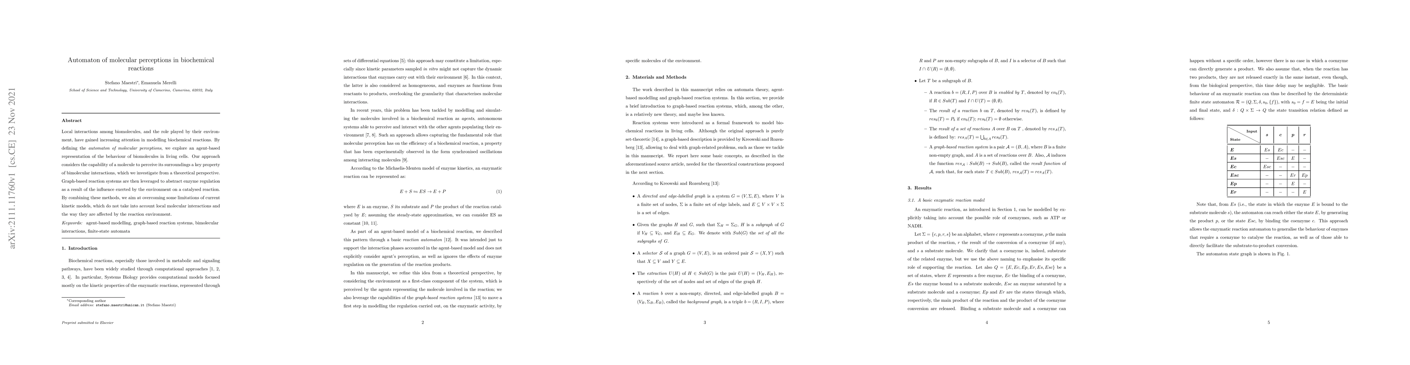 Local interactions among biomolecules, and the role played by their environment, have gained increasing attention in modelling biochemical reactions. By defining the automaton of molecular perceptions, we explore an agent-based representation of the behaviour of biomolecules in living cells. Our approach considers the capability of a molecule to perceive its surroundings a key property of bimolecular interactions, which we investigate from a theoretical perspective. Graph-based reaction systems are then leveraged to abstract enzyme regulation as a result of the influence exerted by the environment on a catalysed reaction. By combining these methods, we aim at overcoming some limitations of current kinetic models, which do not take into account local molecular interactions and the way they are affected by the reaction environment.