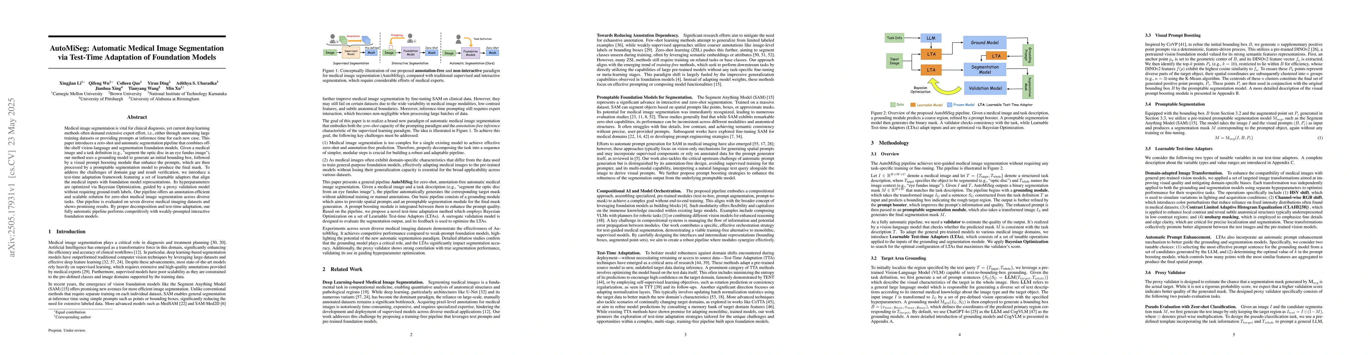 The research introduces AutoMiSeg, a zero-shot automatic medical image segmentation pipeline. It combines vision-language and segmentation foundation models, employing a grounding model for initial bounding boxes, a visual prompt boosting module for enhancing prompts, and a promptable segmentation model for final mask generation. A test-time adaptation framework with learnable adaptors aligns medical inputs with foundation model representations, optimized via Bayesian Optimization guided by a proxy validation model without ground-truth labels.