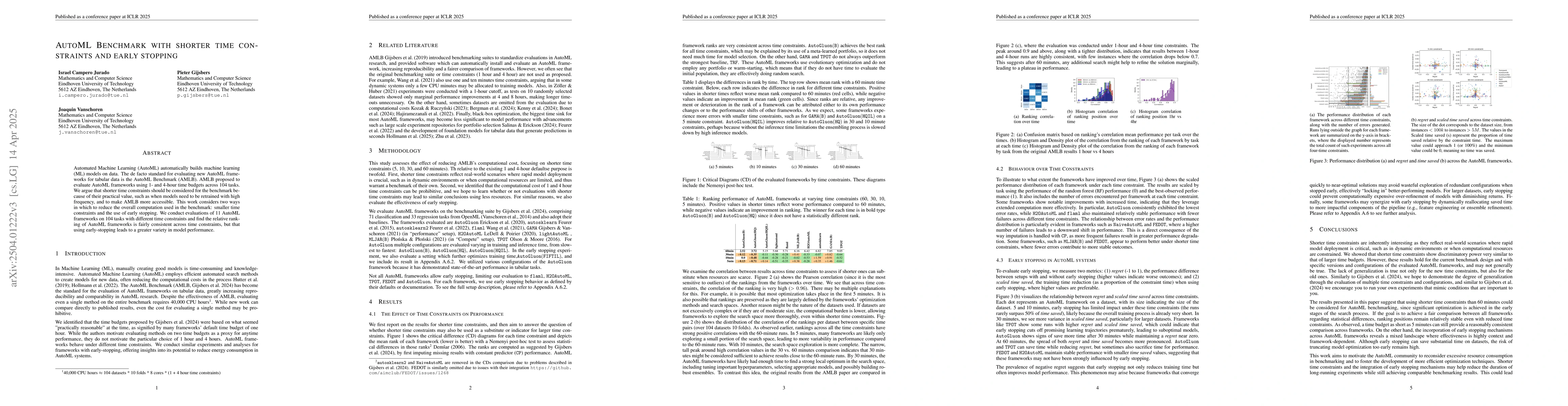 This work distinguishes itself by focusing on shorter time constraints and early stopping, which have not been extensively explored in the AutoML Benchmark context.