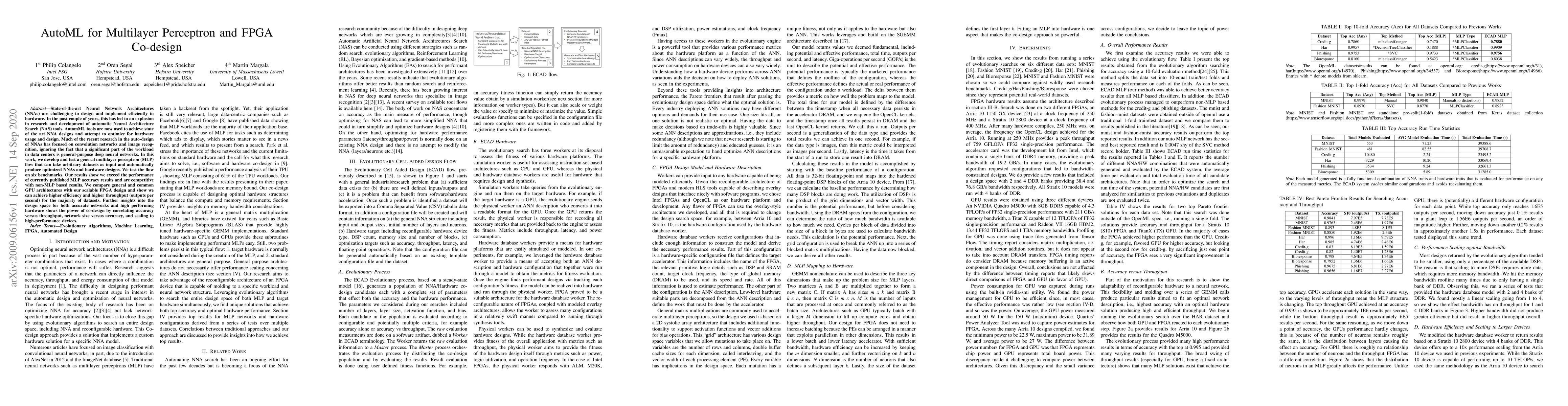 State-of-the-art Neural Network Architectures (NNAs) are challenging to design and implement efficiently in hardware. In the past couple of years, this has led to an explosion in research and development of automatic Neural Architecture Search (NAS) tools. AutomML tools are now used to achieve state of the art NNA designs and attempt to optimize for hardware usage and design. Much of the recent research in the auto-design of NNAs has focused on convolution networks and image recognition, ignoring the fact that a significant part of the workload in data centers is general-purpose deep neural networks. In this work, we develop and test a general multilayer perceptron (MLP) flow that can take arbitrary datasets as input and automatically produce optimized NNAs and hardware designs. We test the flow on six benchmarks. Our results show we exceed the performance of currently published MLP accuracy results and are competitive with non-MLP based results. We compare general and common GPU architectures with our scalable FPGA design and show we can achieve higher efficiency and higher throughput (outputs per second) for the majority of datasets. Further insights into the design space for both accurate networks and high performing hardware shows the power of co-design by correlating accuracy versus throughput, network size versus accuracy, and scaling to high-performance devices.