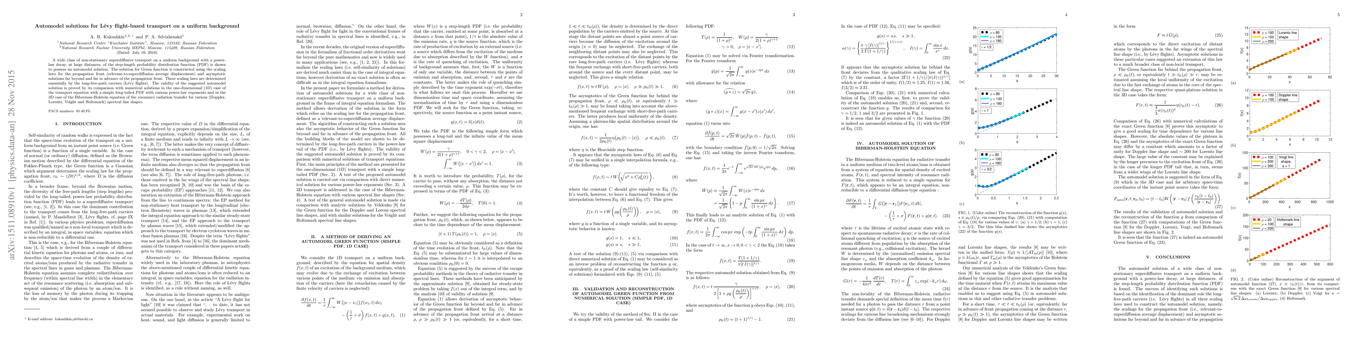 A wide class of non-stationary superdiffusive transport on a uniform background with a power-law decay, at large distances, of the step-length probability distribution function (PDF) is shown to possess an automodel solution. The solution for Green function is constructed using the scaling laws for the propagation front (relevant-to-superdiffusion average displacement) and asymptotic solutions far beyond and far in advance of the propagation front. These scaling laws are determined essentially by the long-free-path carriers (L\'evy flights). The validity of the suggested automodel solution is proved by its comparison with numerical solutions in the one-dimensional (1D) case of the transport equation with a simple long-tailed PDF with various power-law exponents and in the 3D case of the Biberman-Holstein equation of the resonance radiation transfer for various (Doppler, Lorentz, Voight and Holtsmark) spectral line shapes.
