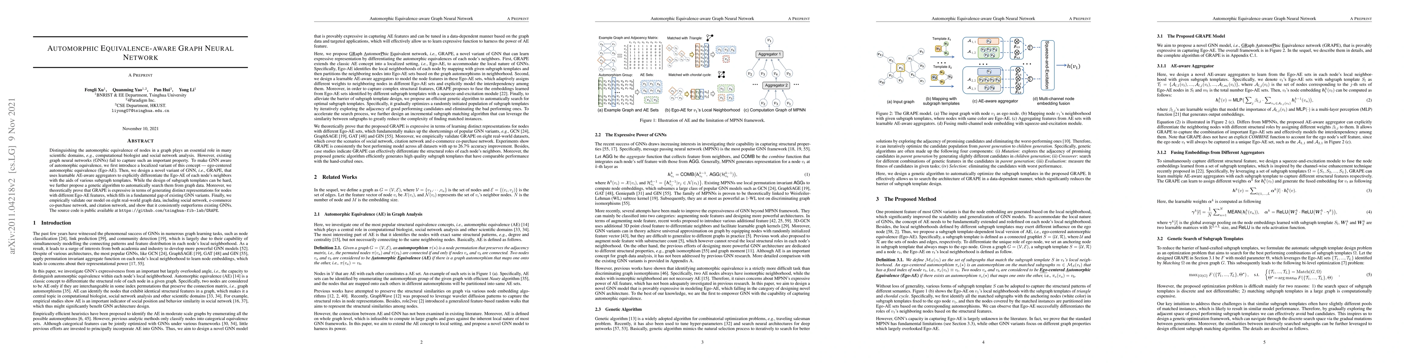 Distinguishing the automorphic equivalence of nodes in a graph plays an essential role in many scientific domains, e.g., computational biologist and social network analysis. However, existing graph neural networks (GNNs) fail to capture such an important property. To make GNN aware of automorphic equivalence, we first introduce a localized variant of this concept -- ego-centered automorphic equivalence (Ego-AE). Then, we design a novel variant of GNN, i.e., GRAPE, that uses learnable AE-aware aggregators to explicitly differentiate the Ego-AE of each node's neighbors with the aids of various subgraph templates. While the design of subgraph templates can be hard, we further propose a genetic algorithm to automatically search them from graph data. Moreover, we theoretically prove that GRAPE is expressive in terms of generating distinct representations for nodes with different Ego-AE features, which fills in a fundamental gap of existing GNN variants. Finally, we empirically validate our model on eight real-world graph data, including social network, e-commerce co-purchase network, and citation network, and show that it consistently outperforms existing GNNs. The source code is public available at https://github.com/tsinghua-fib-lab/GRAPE.