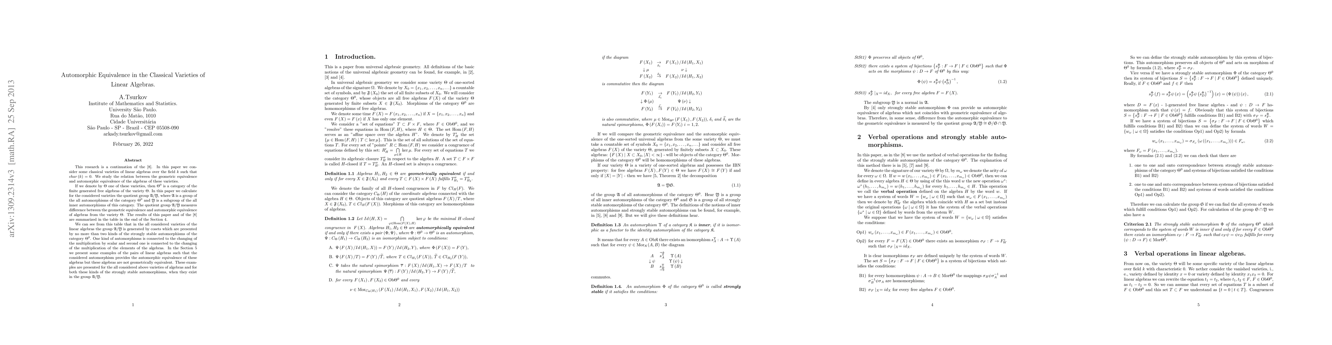 This paper investigates classical varieties of linear algebras over fields of characteristic 0, calculating the quotient group of automorphisms to measure differences between geometric and automorphic equivalence. The study reveals that this group is generated by two types of strongly stable automorphisms, illustrating cases where automorphic equivalence does not imply geometric equivalence.