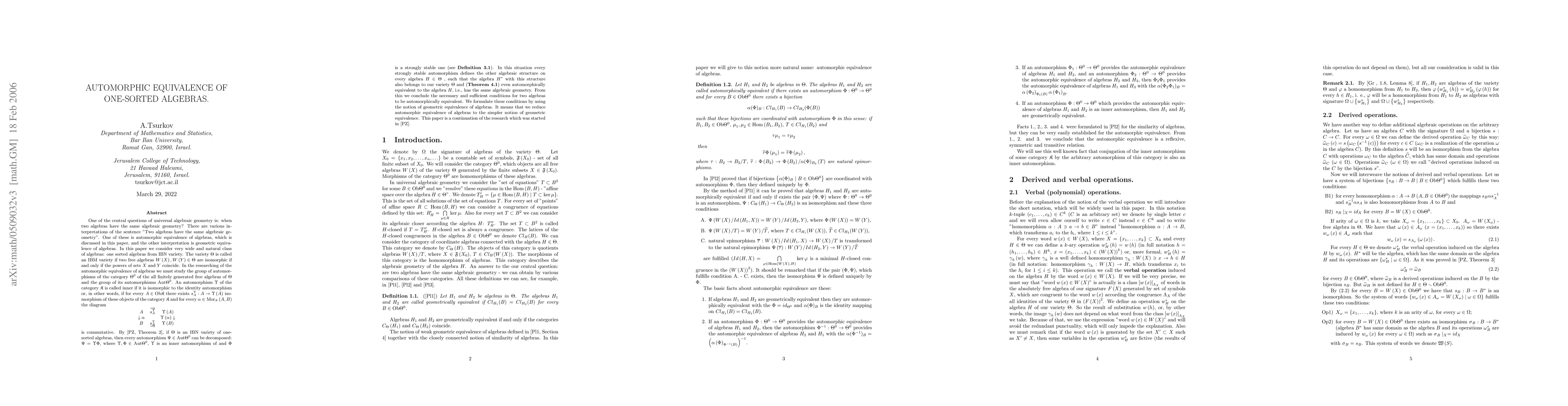 One of the central questions of universal algebraic geometry is: when two algebras have the same algebraic geometry? There are various interpretations of the sentence "Two algebras have the same algebraic geometry". One of these is automorphic equivalence of algebras, which is discussed in this paper, and the other interpretation is geometric equivalence of algebras. In this paper we consider very wide and natural class of algebras: one sorted algebras from IBN variety. The variety is called an IBM variety if two free algebras W(X), W(Y) of this variety are isomorphic if and only if the powers of sets X and Y coincide. In the researching of the automorphic equivalence of algebras we must study the group of automorphisms of the category of the all finitely generated free algebras of our variety and the group of its automorphisms. By [PZ, Theorem 2], if we deal with an IBN variety of one-sorted algebras, then every strongly stable (see Definition 3.1) automorphism of our category defines the other algebraic structure on every algebra H of our variety, such that this algebra with the new algebraic structure automorphically equivalent to the algebra H (Theorem 4.1), i.e., has the same algebraic geometry. From this we conclude the necessary and sufficient conditions for two algebras to be automorphically equivalent. We formulate these conditions by using the notion of geometric equivalence of algebras. It means that we reduce automorphic equivalence of algebras to the simpler notion of geometric equivalence. This paper is a continuation of the research which was started in [PZ].