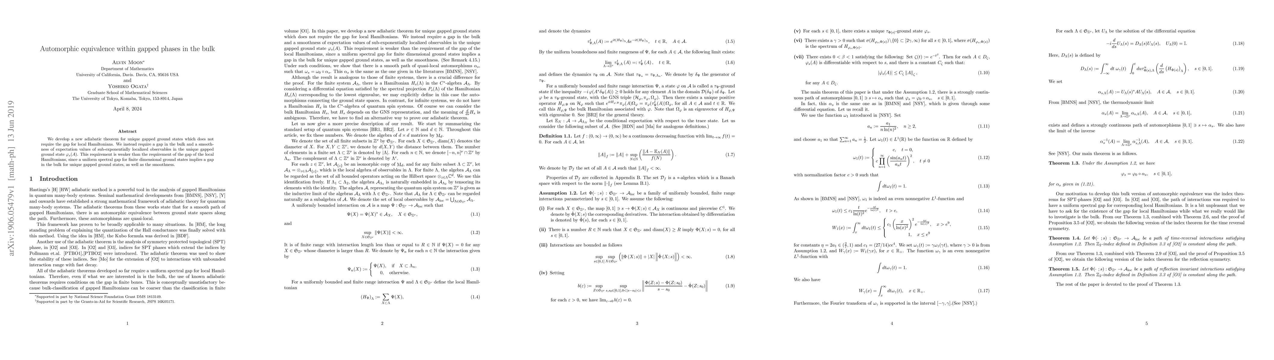 We develop a new adiabatic theorem for unique gapped ground states which does not require the gap for local Hamiltonians. We instead require a gap in the bulk and a smoothness of expectation values of sub-exponentially localized observables in the unique gapped ground state $\varphi_s(A)$. This requirement is weaker than the requirement of the gap of the local Hamiltonians, since a uniform spectral gap for finite dimensional ground states implies a gap in the bulk for unique gapped ground states, as well as the smoothness.