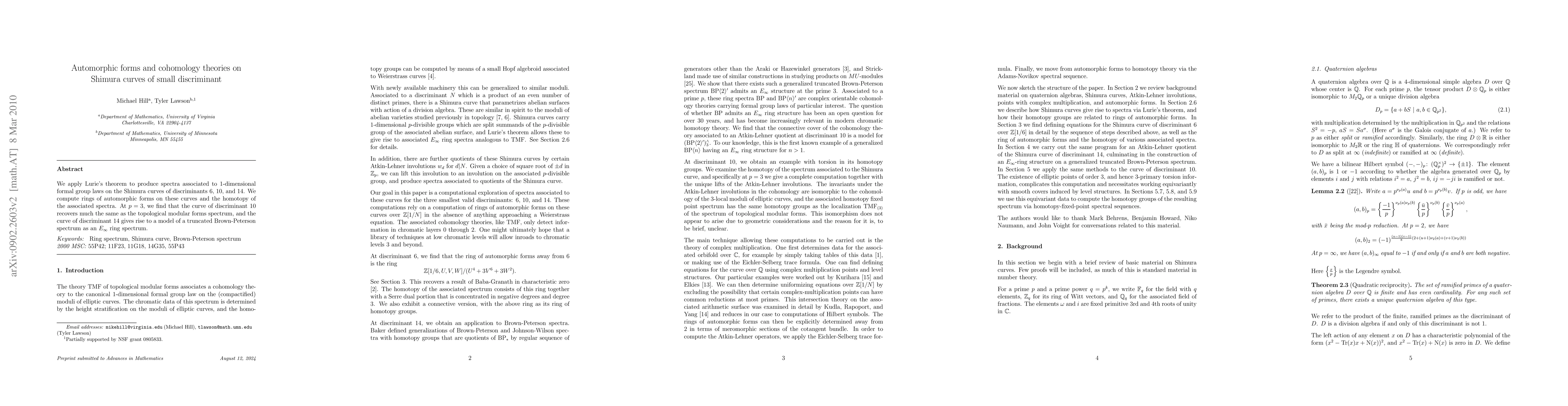 This research paper computes homotopy groups of spectra linked to Shimura curves of small discriminants (6, 10, 14) using integral rings of automorphic forms. A key finding is that a generalized truncated Brown-Peterson spectrum BP<2> behaves as an E_infty ring spectrum at the prime 3.