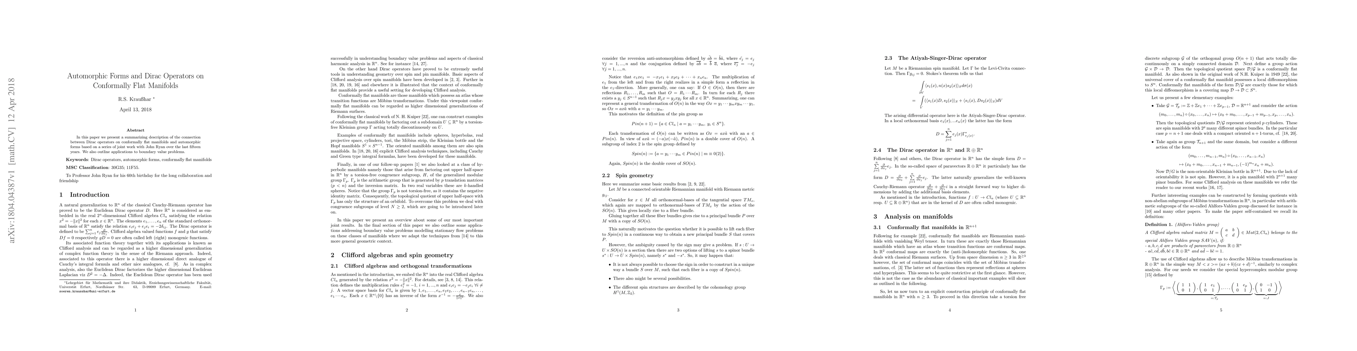 This paper explores the connection between Dirac operators on conformally flat manifolds and automorphic forms, summarizing fifteen years of collaborative work with John Ryan. It also highlights applications to boundary value problems.