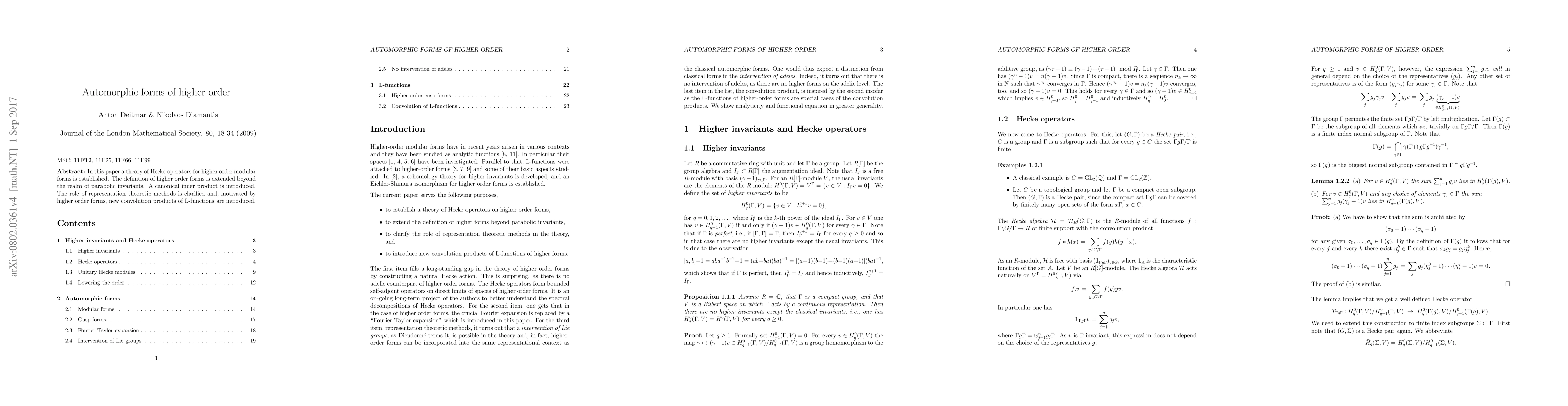 In this paper a theory of Hecke operators for higher order modular forms is established. The definition of cusp forms and attached L-functions is extended beyond the realm of parabolic invariants. The role of representation theoretic methods is clarified and, motivated by higher order forms, new convolution products of L-functions are introduced.