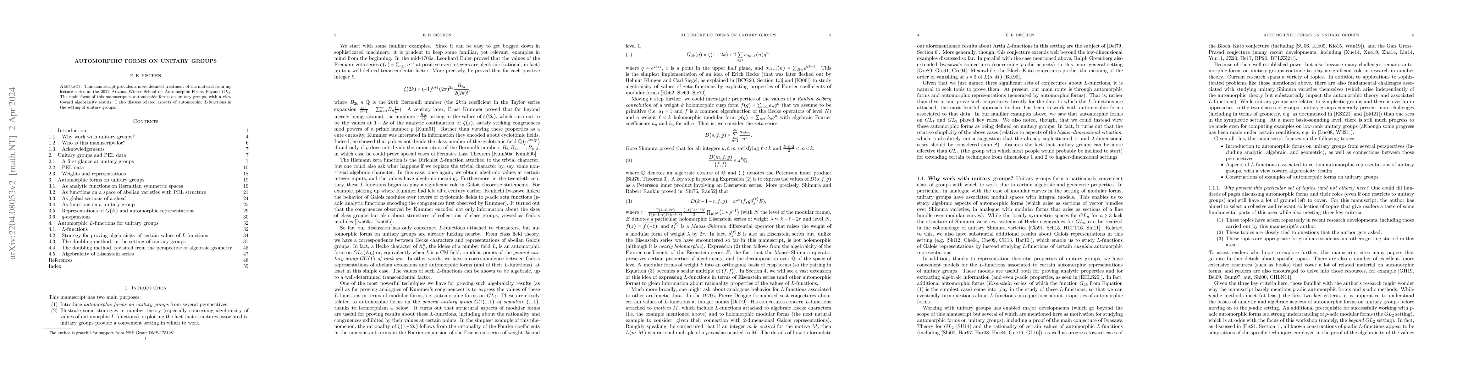 This paper delves into automorphic forms on unitary groups, aiming to achieve algebraicity results, and explores related automorphic $L$-functions in this context. It serves as an extended version of a lecture series on automorphic forms beyond $GL_2$.