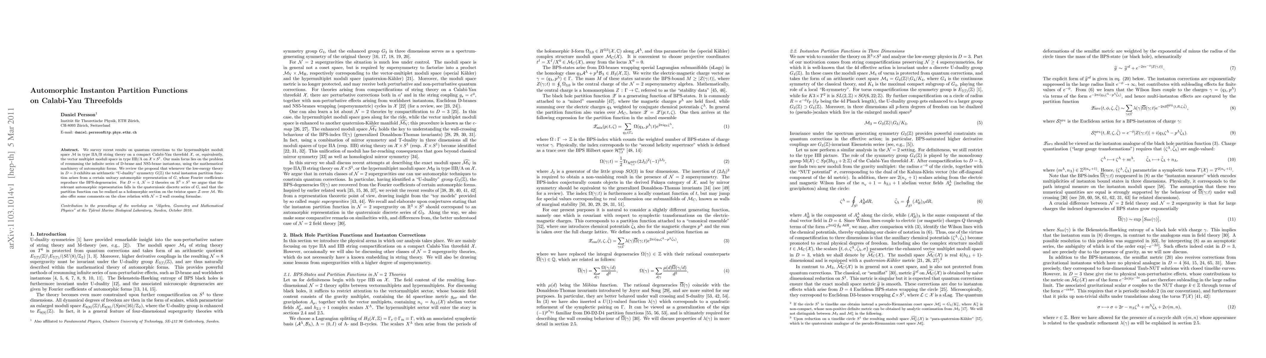 We survey recent results on quantum corrections to the hypermultiplet moduli space M in type IIA/B string theory on a compact Calabi-Yau threefold X, or, equivalently, the vector multiplet moduli space in type IIB/A on X x S^1. Our main focus lies on the problem of resumming the infinite series of D-brane and NS5-brane instantons, using the mathematical machinery of automorphic forms. We review the proposal that whenever the low-energy theory in D=3 exhibits an arithmetic "U-duality" symmetry G(Z) the total instanton partition function arises from a certain unitary automorphic representation of G, whose Fourier coefficients reproduce the BPS-degeneracies. For D=4, N=2 theories on R^3 x S^1 we argue that the relevant automorphic representation falls in the quaternionic discrete series of G, and that the partition function can be realized as a holomorphic section on the twistor space Z over M. We also offer some comments on the close relation with N=2 wall crossing formulae.
