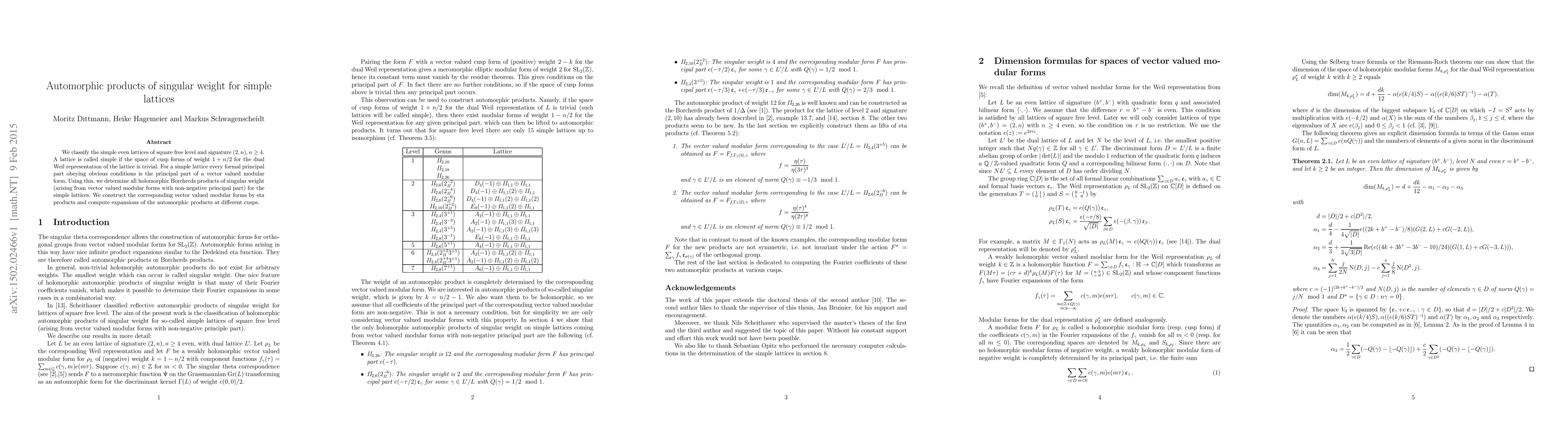 We classify the simple even lattices of square free level and signature (2,n) for n > 3. A lattice is called simple if the space of cusp forms of weight 1+n/2 for the dual Weil representation of the lattice is trivial. For a simple lattice every formal principal part obeying obvious conditions is the principal part of a vector valued modular form. Using this, we determine all holomorphic Borcherds products of singular weight (arising from vector valued modular forms with non-negative principal part) for the simple lattices. We construct the corresponding vector valued modular forms by eta products and compute expansions of the automorphic products at different cusps.