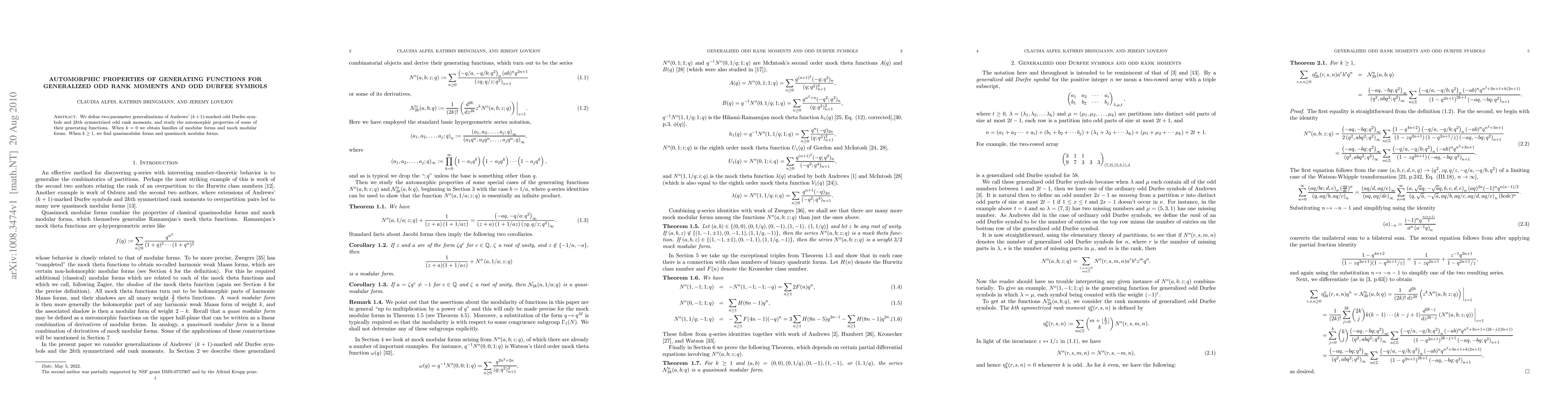 This paper explores automorphic properties of generating functions for odd rank moments and Durfee symbols, finding quasimodular forms and mock modular forms in certain cases.