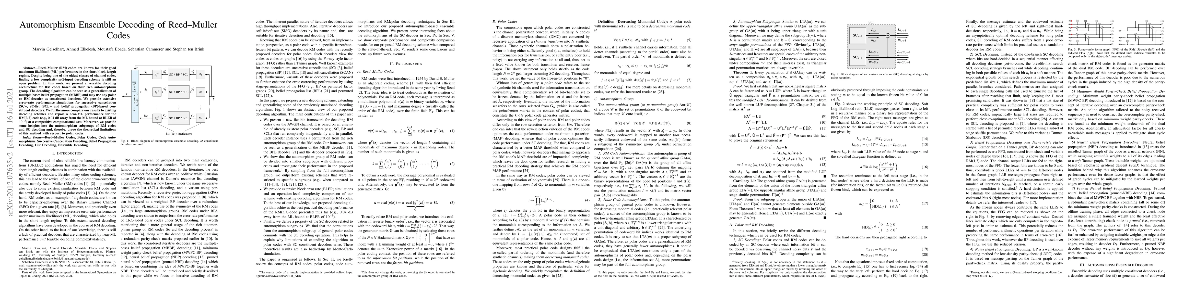 This paper introduces a new decoding architecture for Reed-Muller codes leveraging their automorphism group, achieving near-maximum likelihood performance at a competitive computational cost. The proposed method generalizes multiple-bases belief propagation and outperforms existing schemes for the RM(3,7)-code.