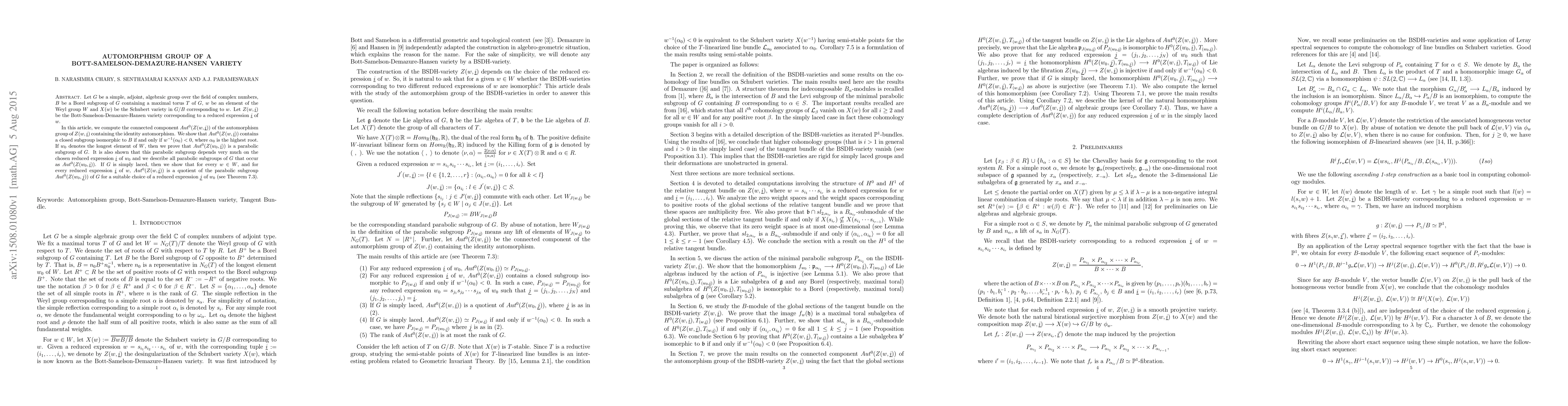 The paper employs algebraic geometry techniques, specifically focusing on Bott-Samelson-Demazure-Hansen (BSDH) varieties, to compute the automorphism group containing the identity. It uses reduced expressions of elements in the Weyl group and examines the structure of these automorphism groups in relation to the highest root of the simple, adjoint algebraic group G over complex numbers.