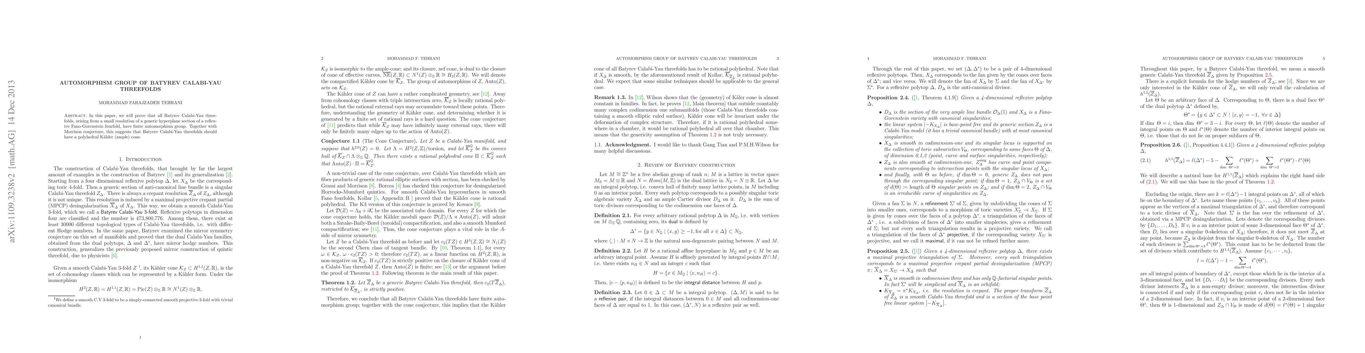 This paper proves that Batyrev Calabi-Yau threefolds derived from small resolutions of generic hyperplane sections of reflexive Fano-Gorenstein fourfolds possess finite automorphism groups, supporting the Morrison conjecture and suggesting these threefolds have polyhedral Kahler cones.