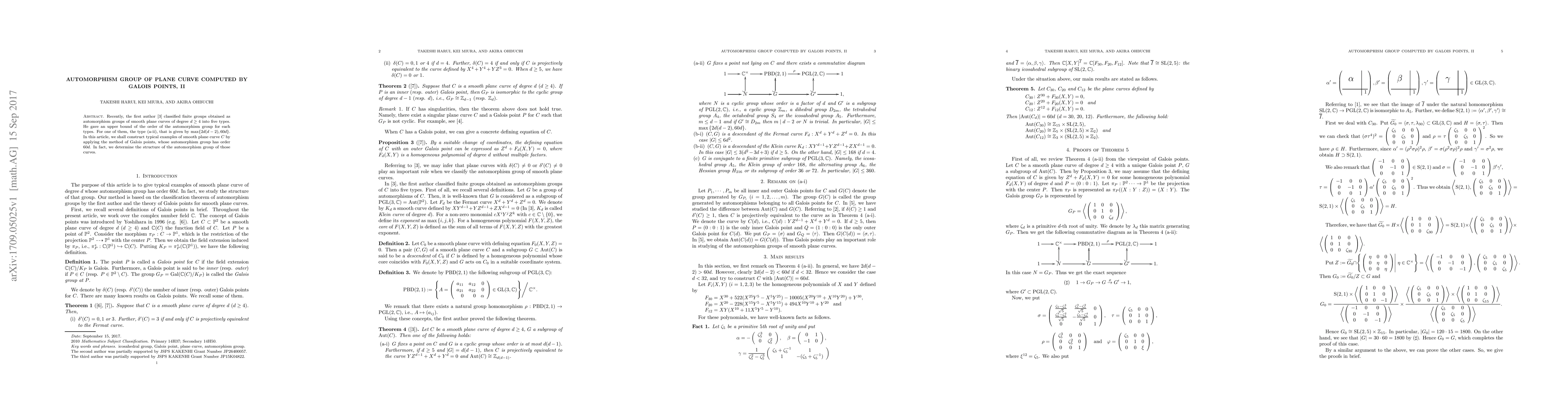 Recently, the first author classified finite groups obtained as automorphism groups of smooth plane curves of degree $d \ge 4$ into five types. He gave an upper bound of the order of the automorphism group for each types. For one of them, the type (a-ii), that is given by $\max \left\{ 2 d (d - 2), 60 d \right\}$. In this article, we shall construct typical examples of smooth plane curve $C$ by applying the method of Galois points, whose automorphism group has order $60 d$. In fact, we determine the structure of the automorphism group of those curves.