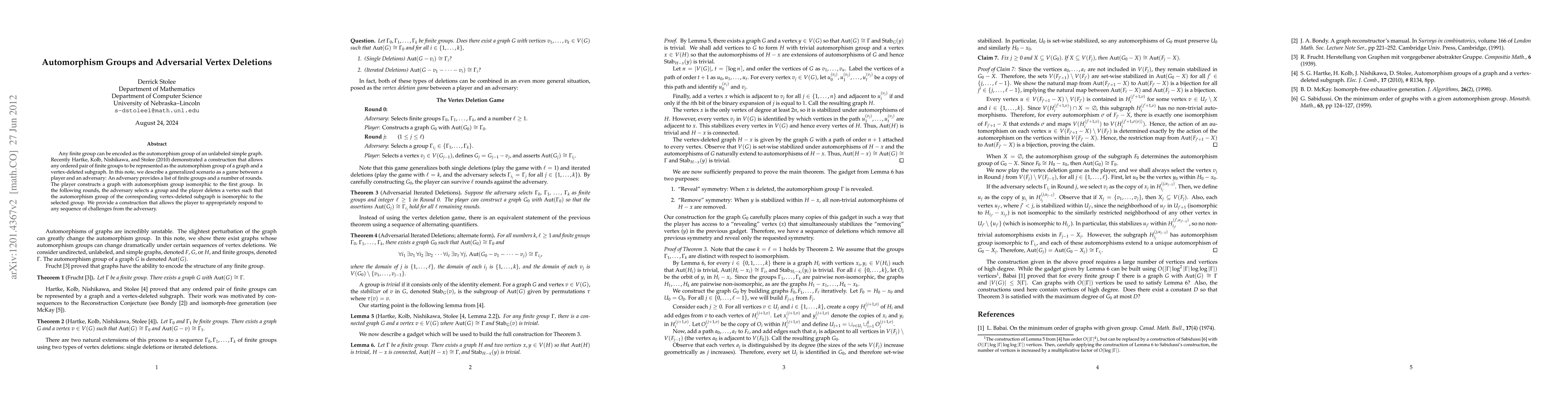 This paper explores a game where a player constructs a graph with a specified automorphism group, and then responds to an adversary who challenges the player to delete vertices such that the resulting subgraphs have automorphism groups matching the adversary's selections. The authors provide a construction ensuring the player can always comply with the adversary's challenges.